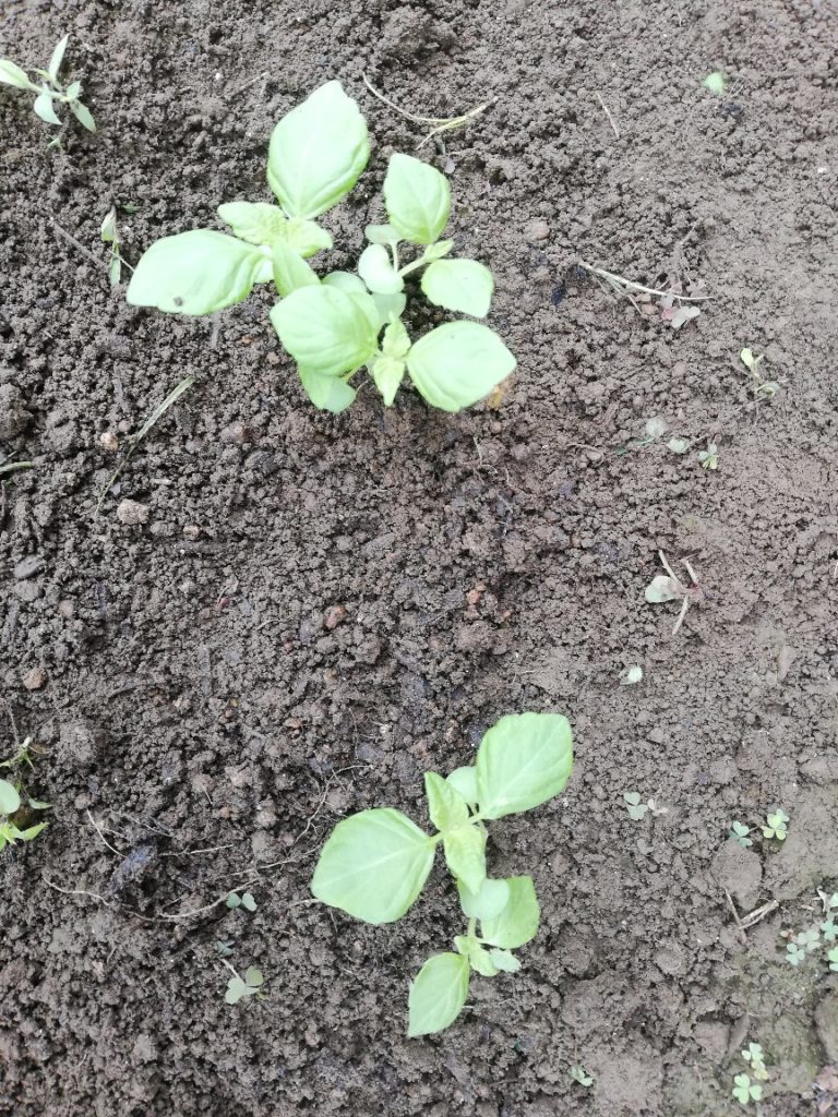 自宅でポットに種をまいて発芽させた苗がほどよい大きさになったので畝外の空きスペースに植えました。しそは食卓に欠かせないものなので、たくさん収穫できると嬉しいです。