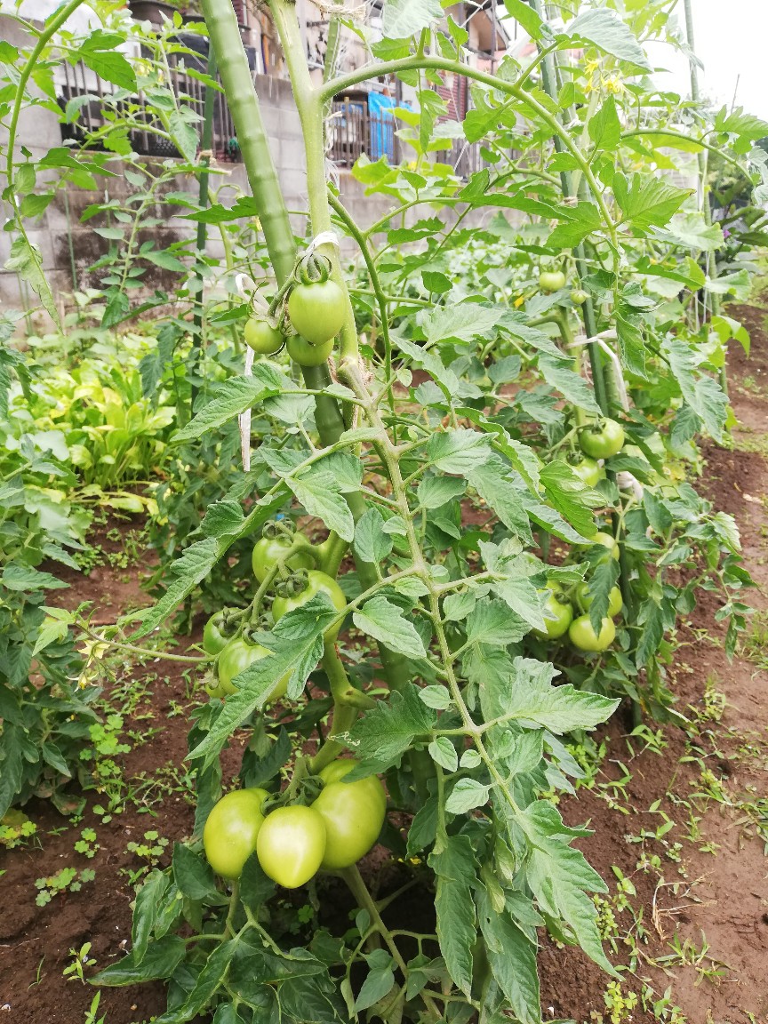 今まで支柱は1本でしたが、3本仕立てで育てているので横広がりになる枝を支えるために支柱を1本斜めに追加しました。先輩Sさんからのアドバイスによるものです。