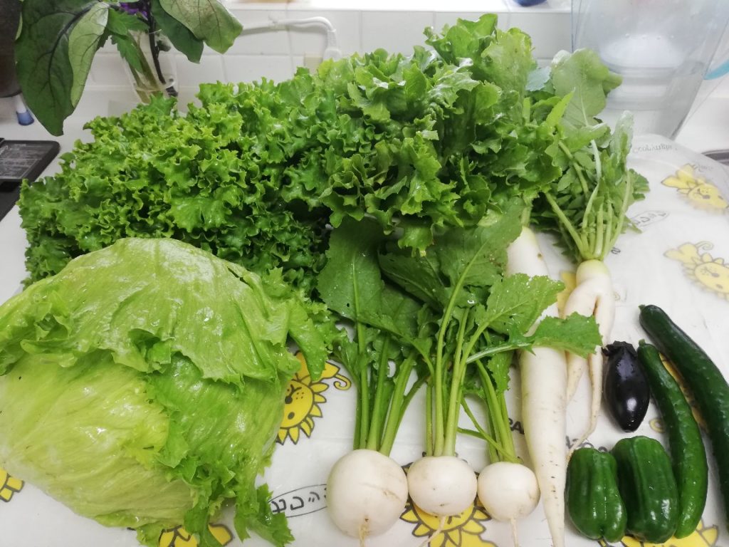 ずっしりとした玉レタスにリーフレタス、大根、カブも小さいながらもできていました。キュウリ、ナス、ピーマンはちょっとずつの収穫です。毎日新鮮野菜の食卓、嬉しくてたまりません。