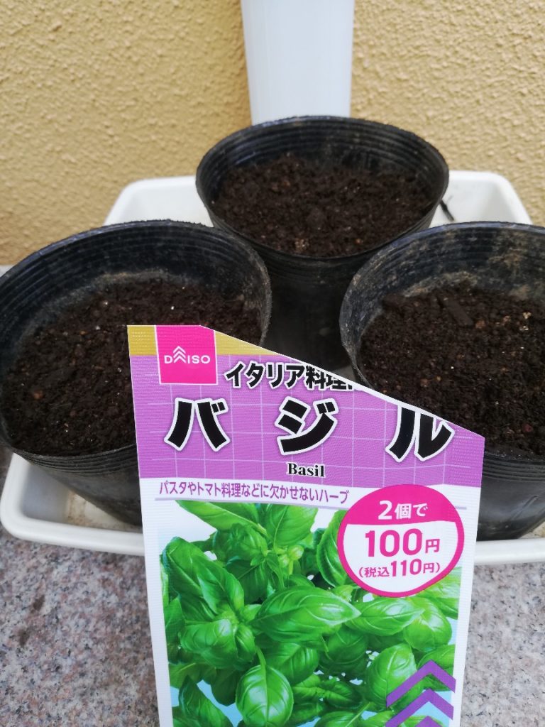 4月28日に蒔いたバジルの種は古かったため発芽せず、改めて買ってきた種を蒔きました。1ポットに5~6粒、合計3ポット蒔きました。
