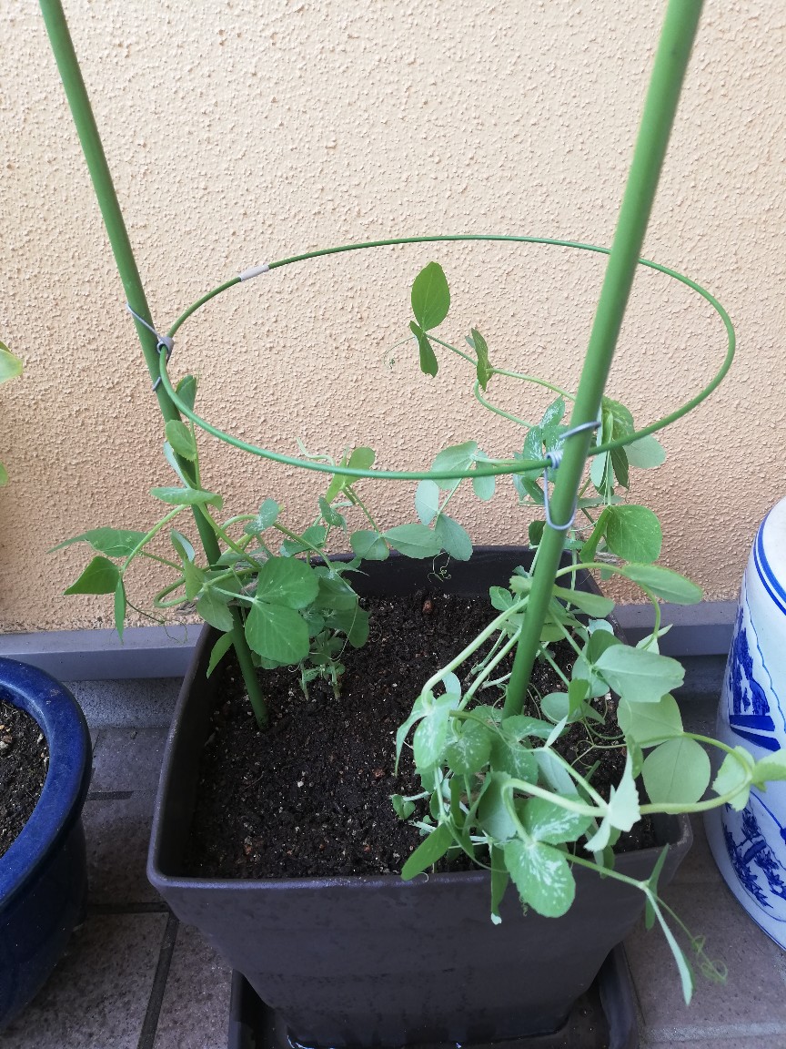 スナップエンドウは種を蒔いてからこの季節ではなかったと気づいたのですが、健気にも成長してきているので大きな鉢に定植しました。スナップエンドウは暑さに弱いので、玄関横の一番涼しいところで管理しますが、おそらく育たないことでしょう。それを確認するためにもまずは様子をみてみます。