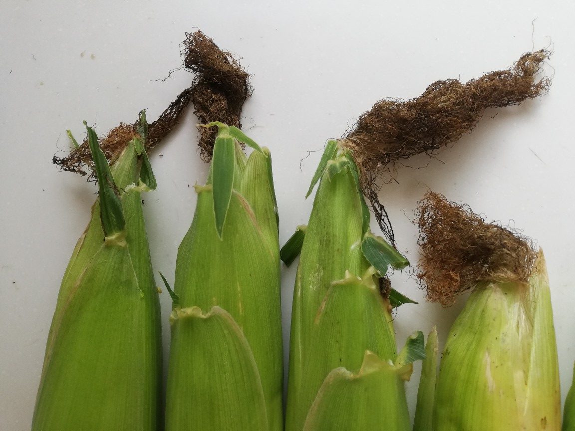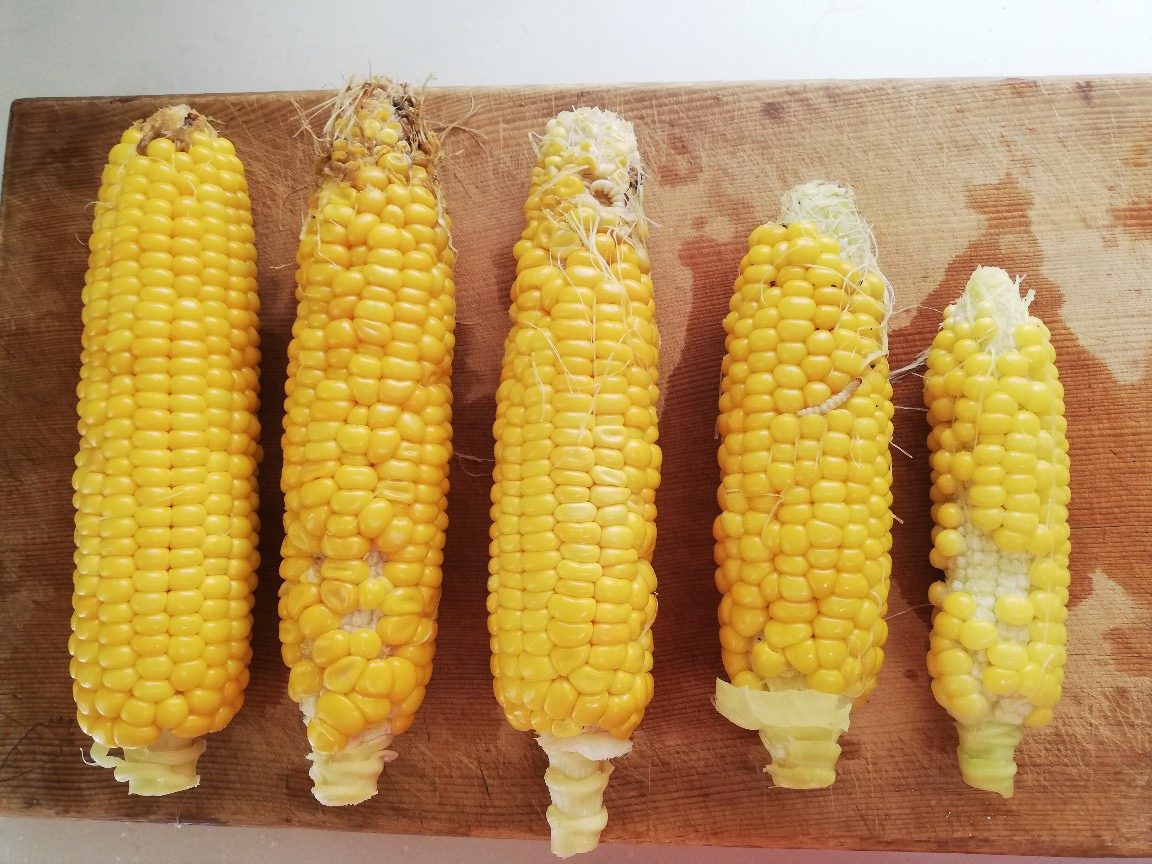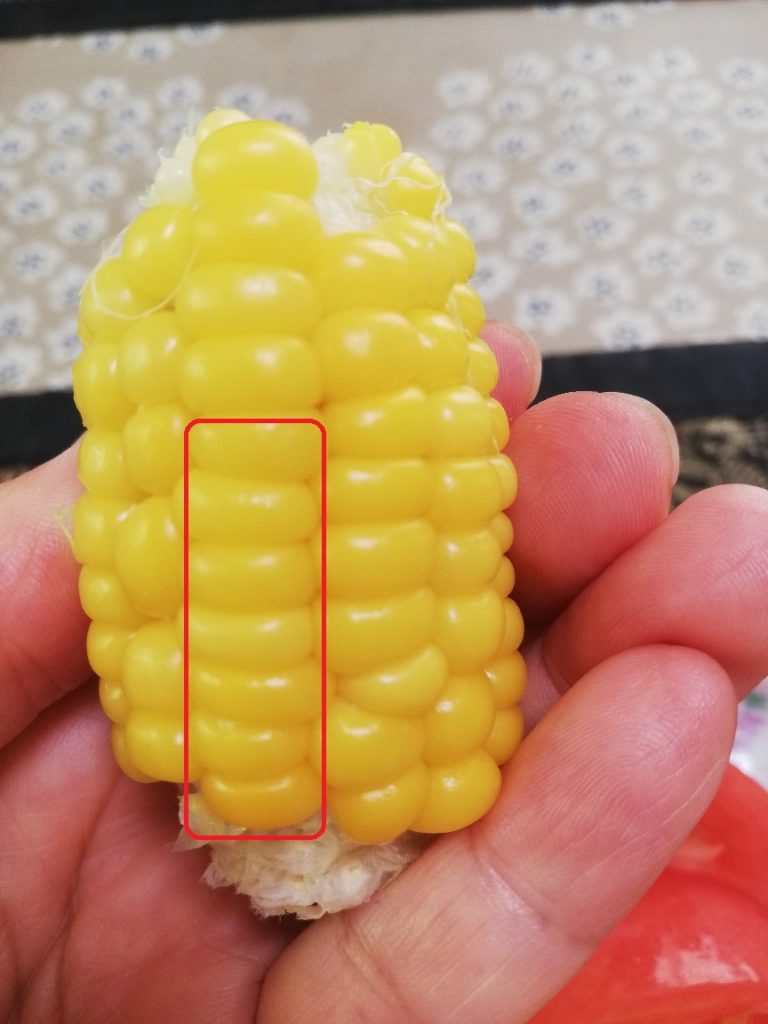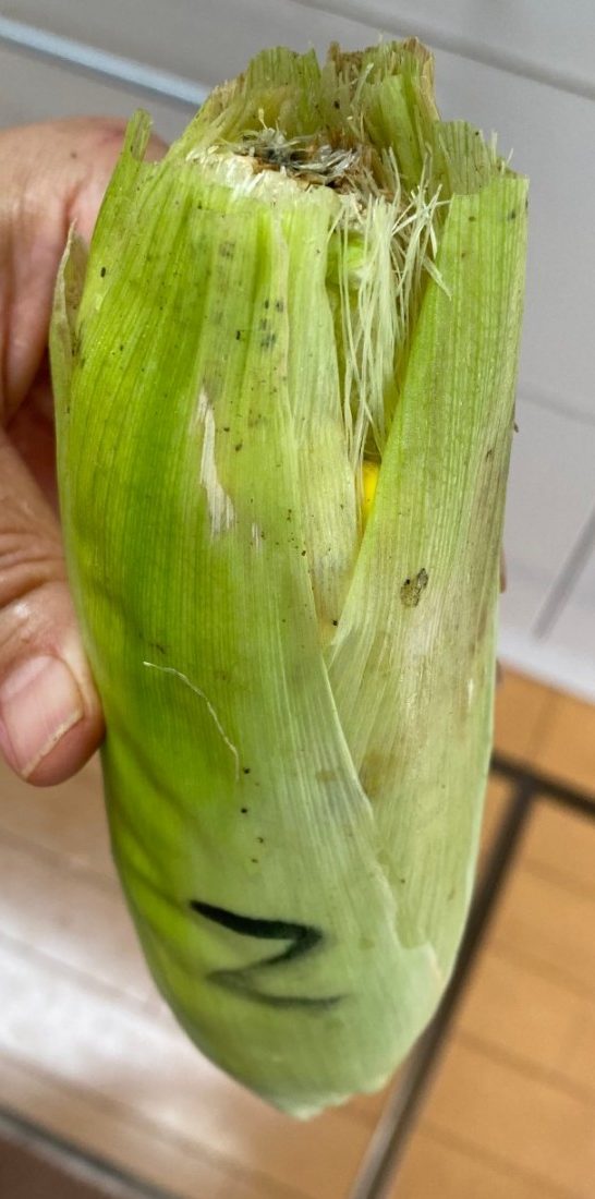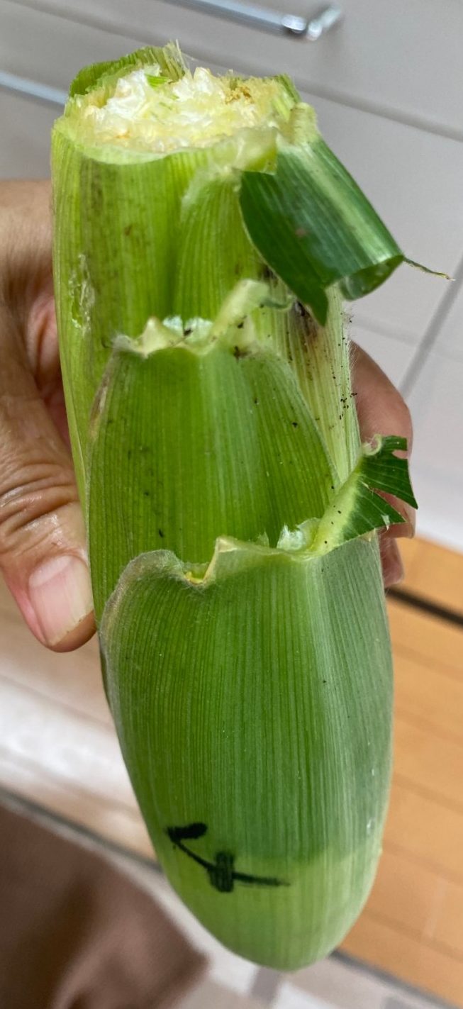 時期外れに収穫したこの1本はヒゲが白くて受粉がきちんとされていなかったので今日まで残さざるを得なかったものでしたが、82の雄穂は全て切除し廃棄してしまっていたのでこれ以上の受粉を望めず、代わりに90の雄穂の花粉をヒゲにパラパラまいていたものでした。今日収穫した時はヒゲが薄い茶色に変化していたので受粉が成立していたと思われ、混合品種になったことが推測されます。