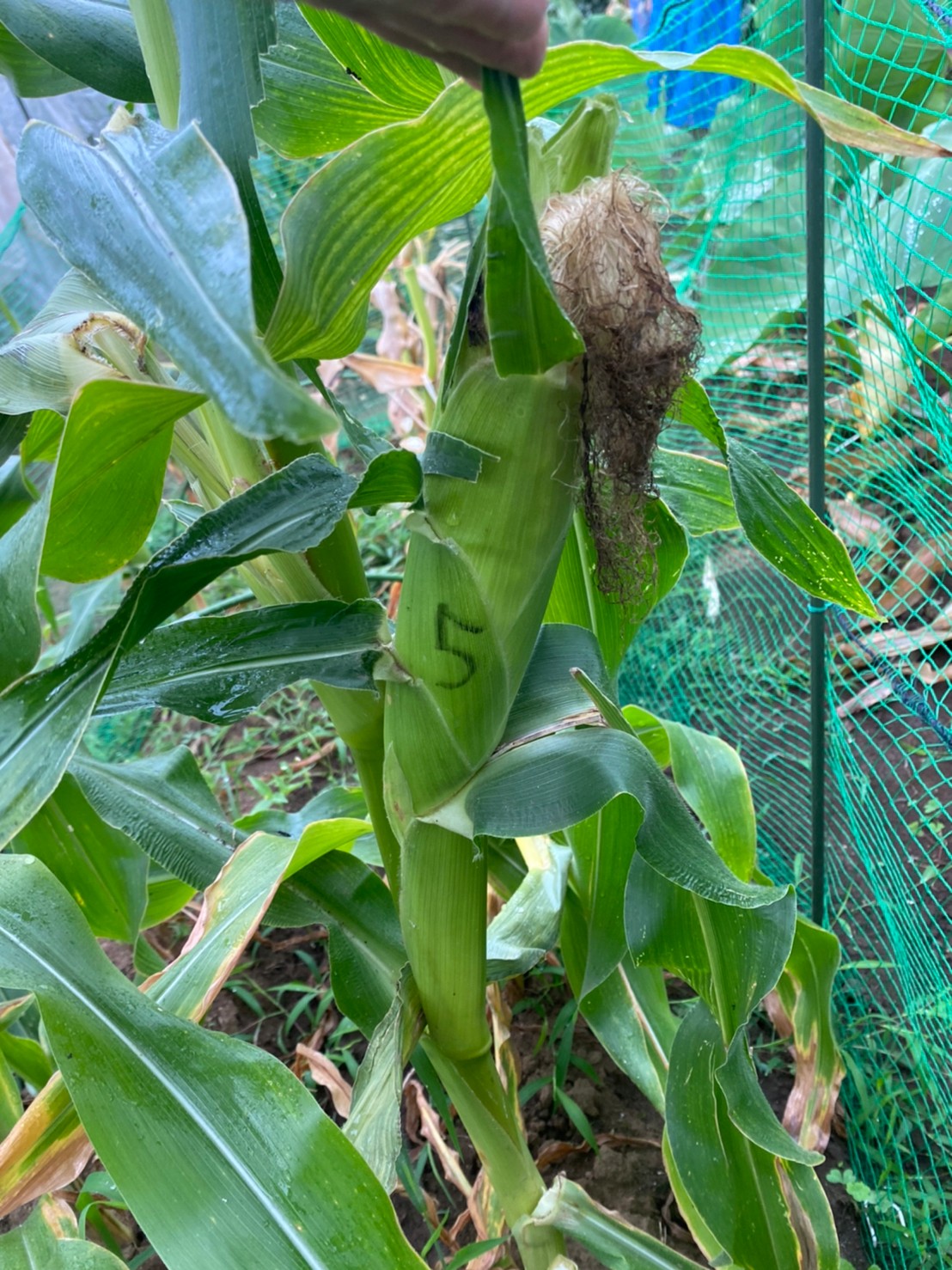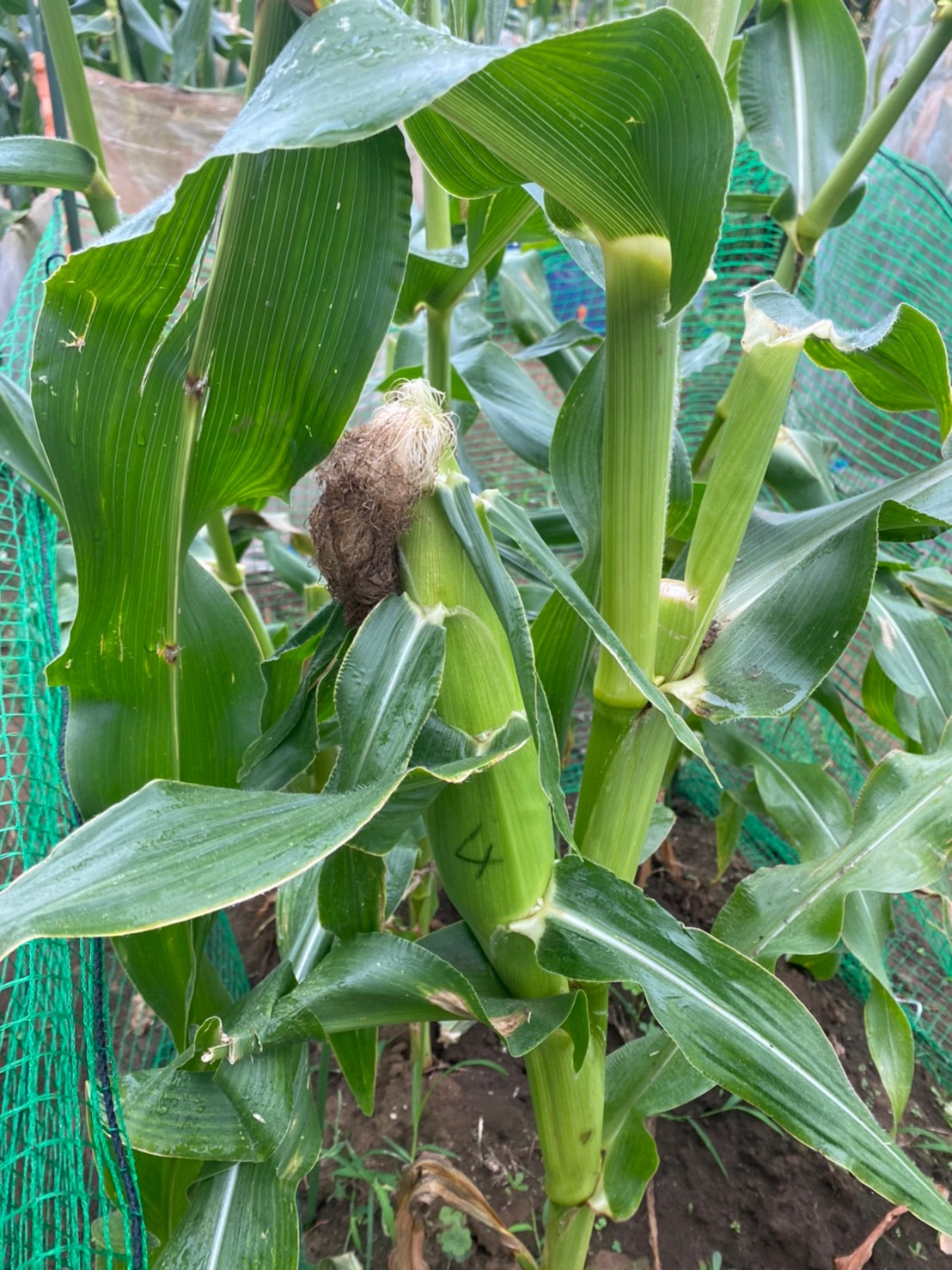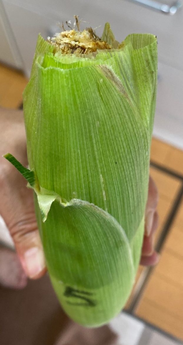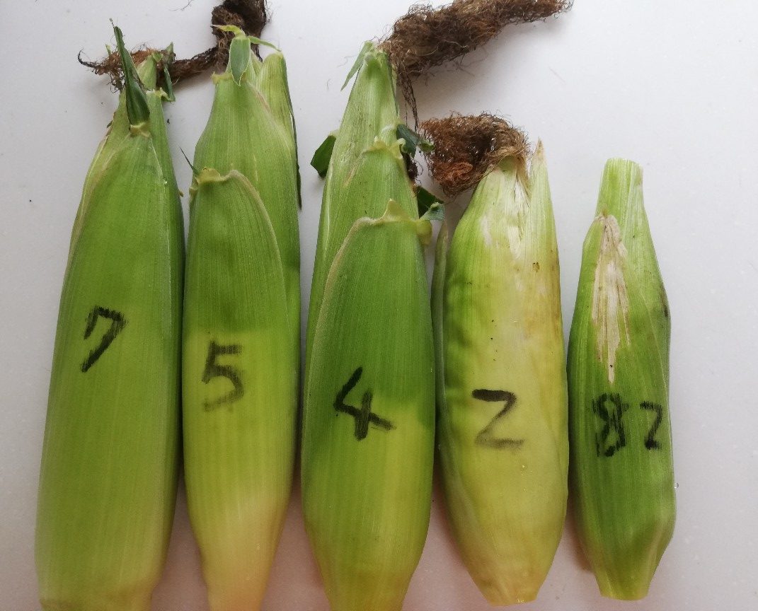 時期外れに収穫したこの1本はヒゲが白くて受粉がきちんとされていなかったので今日まで残さざるを得なかったものでしたが、82の雄穂は全て切除し廃棄してしまっていたのでこれ以上の受粉を望めず、代わりに90の雄穂の花粉をヒゲにパラパラまいていたものでした。今日収穫した時はヒゲが薄い茶色に変化していたので受粉が成立していたと思われ、混合品種になったことが推測されます。