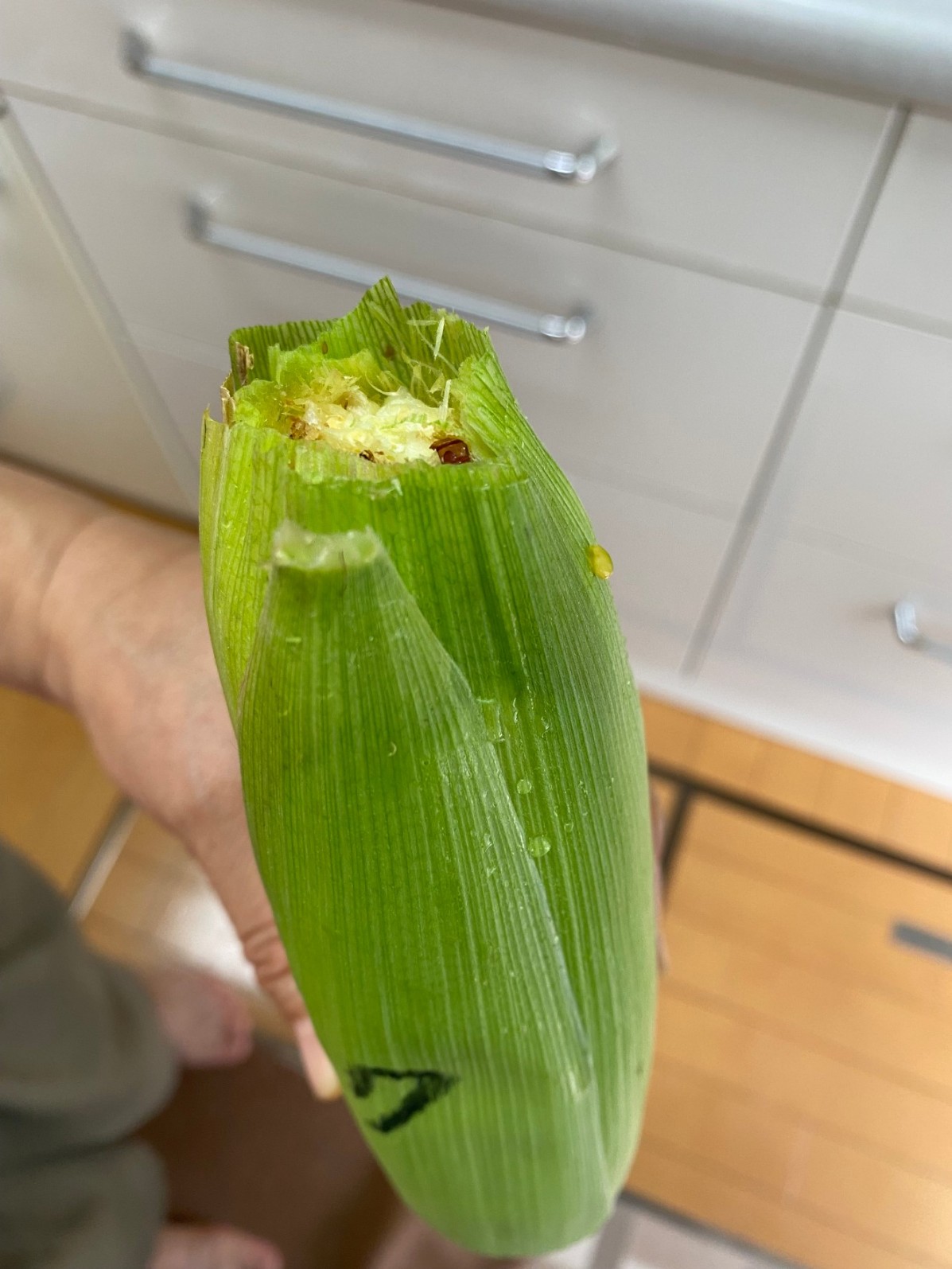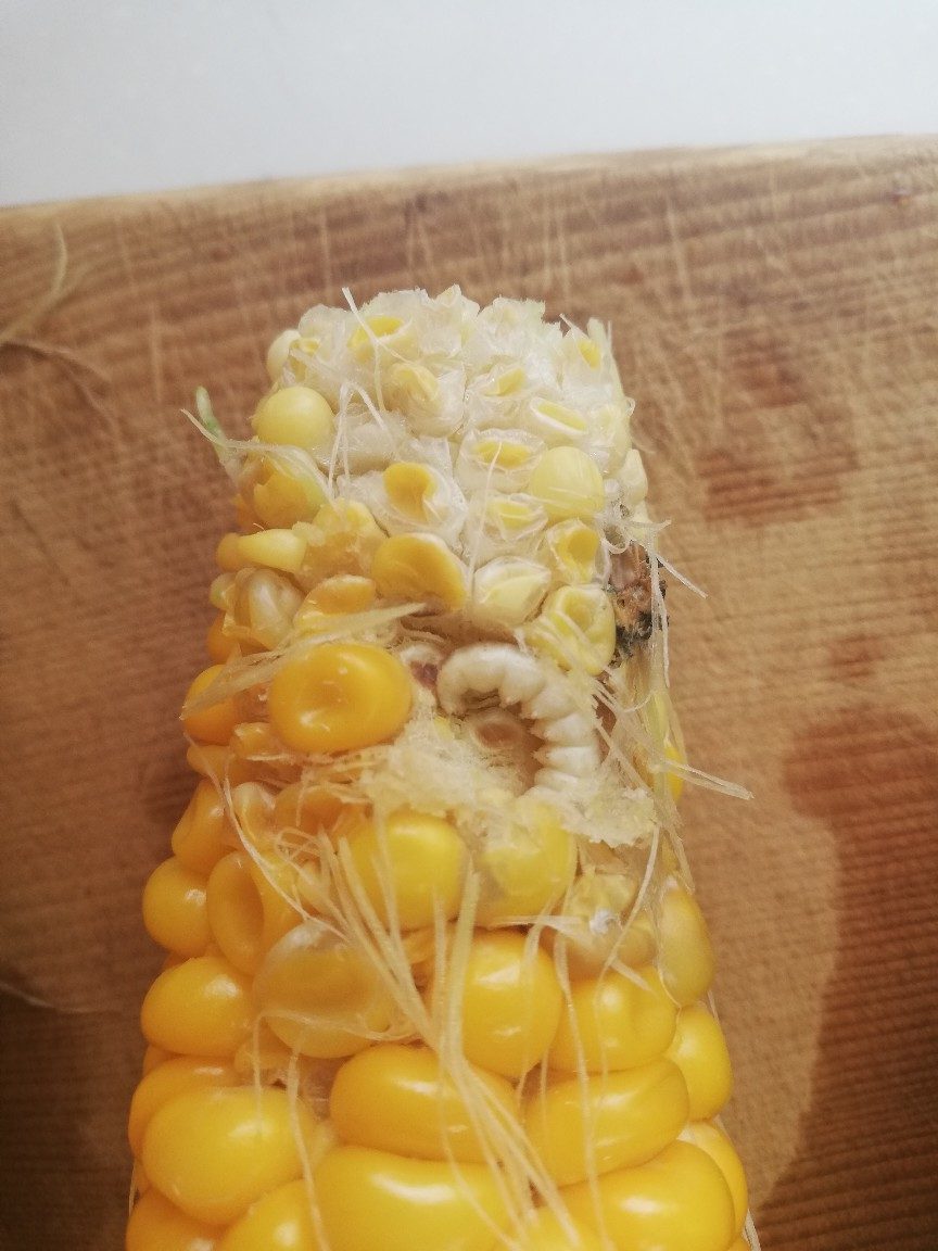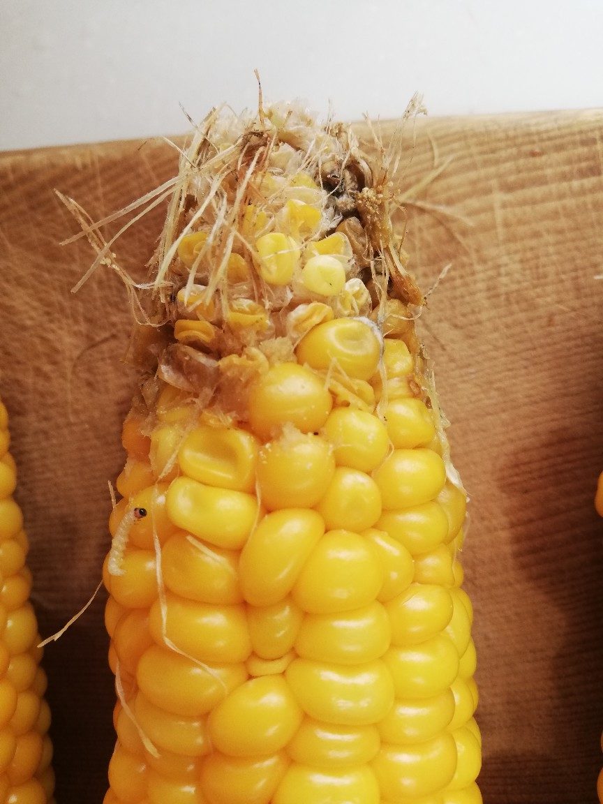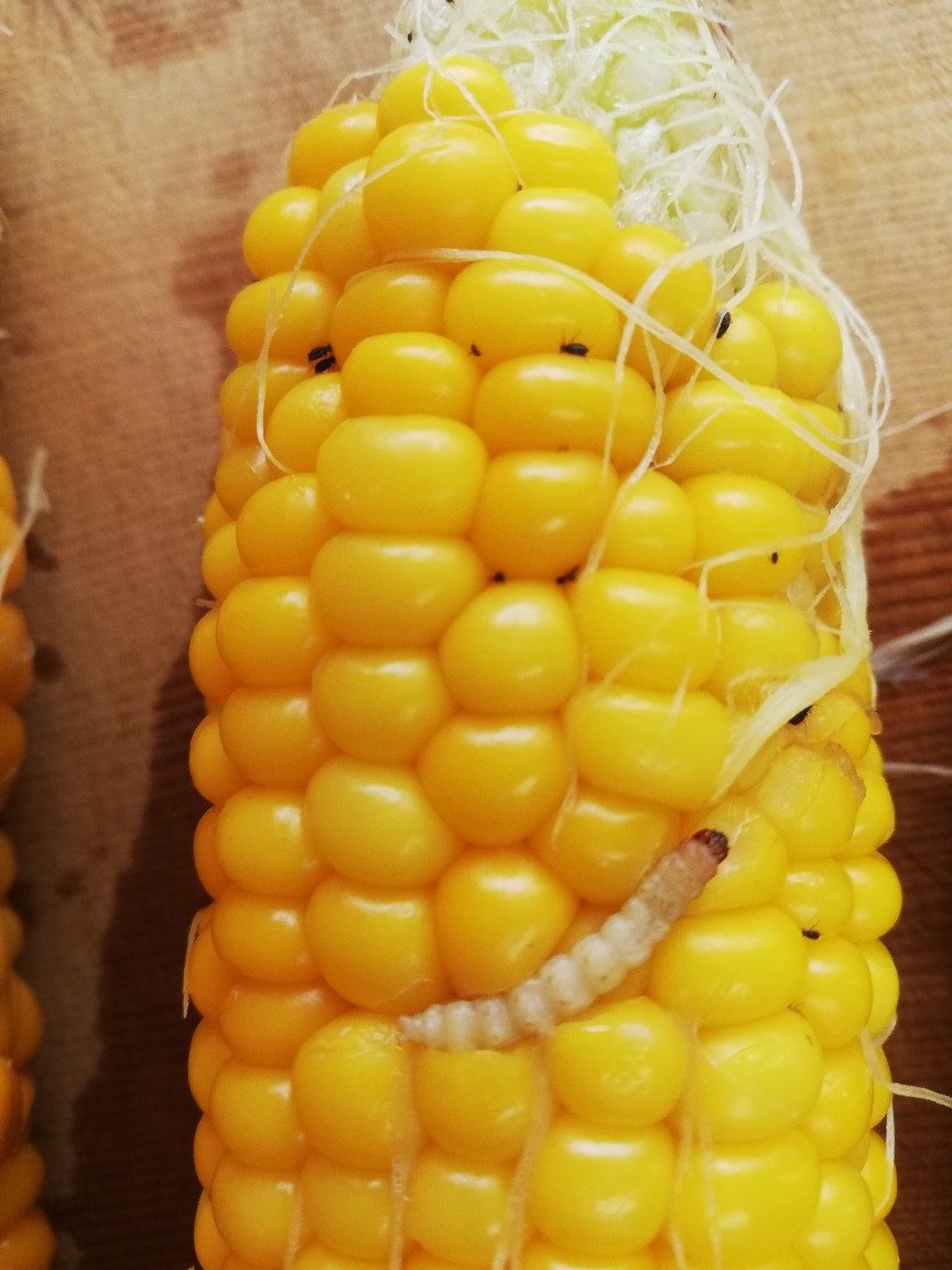 時期外れに収穫したこの1本はヒゲが白くて受粉がきちんとされていなかったので今日まで残さざるを得なかったものでしたが、82の雄穂は全て切除し廃棄してしまっていたのでこれ以上の受粉を望めず、代わりに90の雄穂の花粉をヒゲにパラパラまいていたものでした。今日収穫した時はヒゲが薄い茶色に変化していたので受粉が成立していたと思われ、混合品種になったことが推測されます。