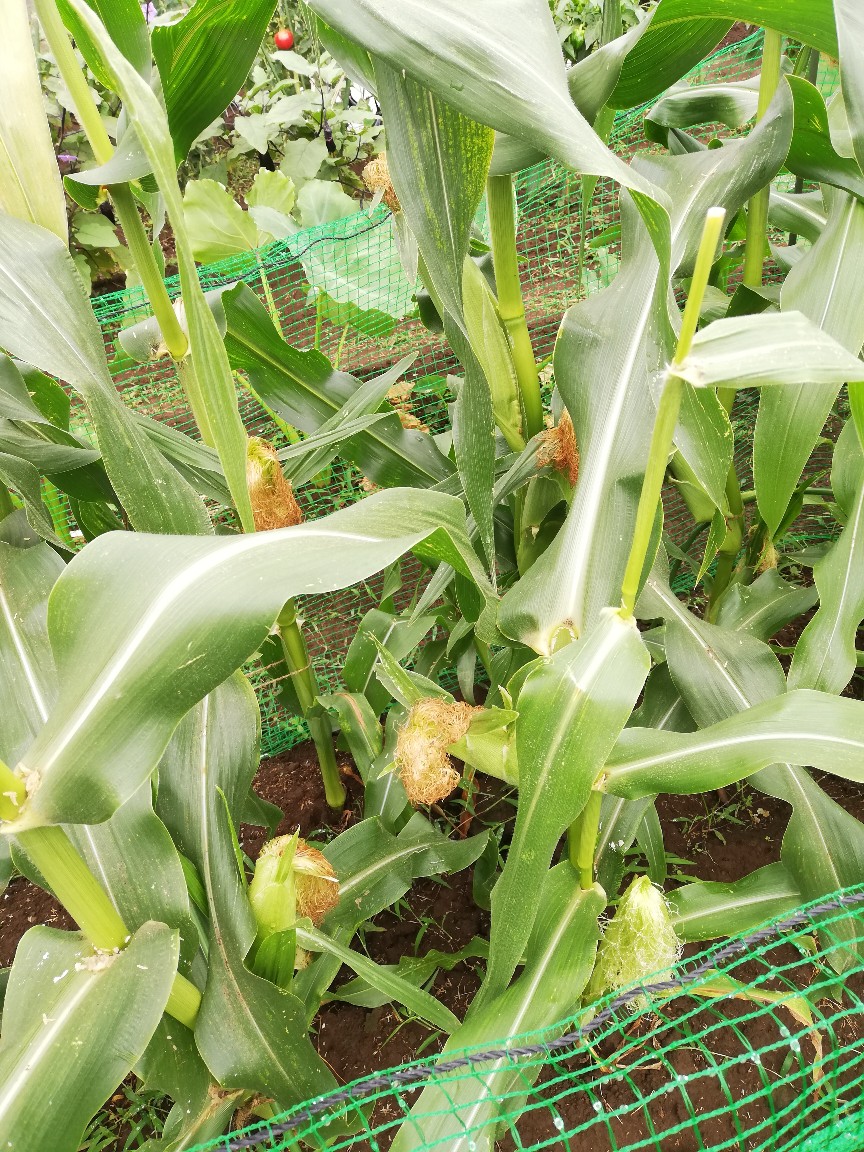 ほとんどのトウモロコシのヒゲがきちんと茶色になっていました。これは既に受粉が成功していたということでしょうか?そう期待したいと思います。他の人のトウモロコシが気になったので見て回ると、雄花をつけたままの人がほとんどでしたが、いつも丁寧に教えてくださるSさんは全て切り落としていました。ヒゲの状態もほぼ同じに見えます。何だか希望が見えてきました。うん、きっと大丈夫。美味しいトウモロコシになるでしょう。楽しみです。