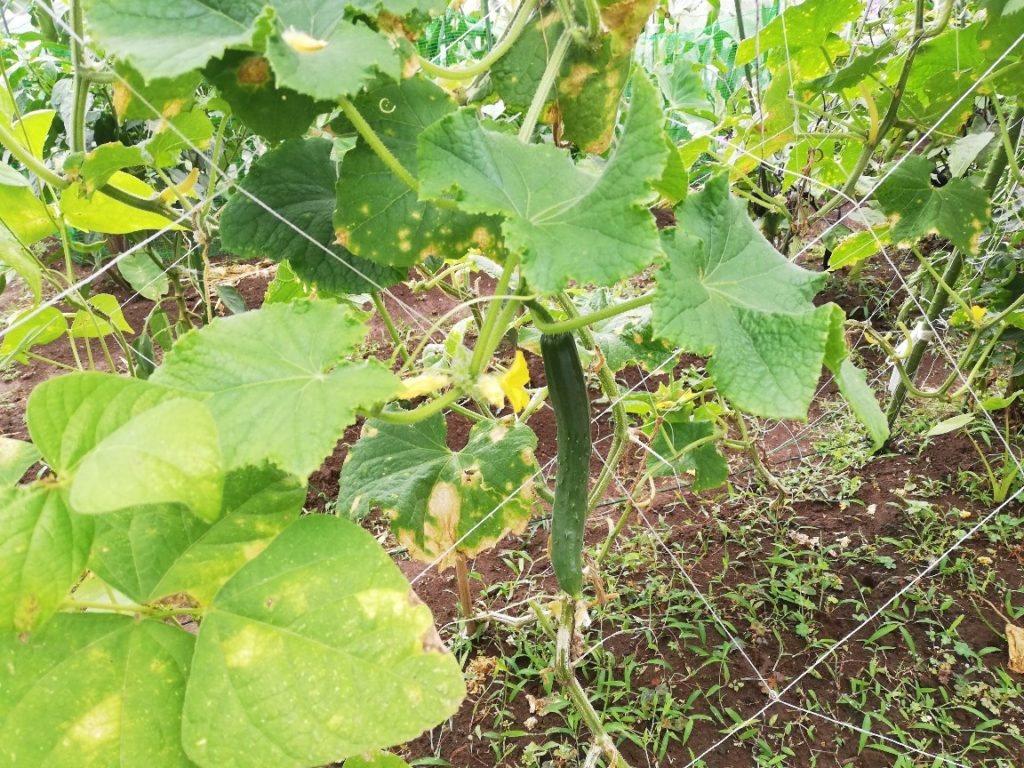 化成肥料をまいたばかりのキュウリですが、何だか元気になってきたような気がします。花もチラホラ目につきました。肥料の効き目はゆっくり現れるはずなので、雨がたっぷり降って水を思いっきり吸収したせいなのでしょうか?真相はわかりませんがとにかく良かったです。