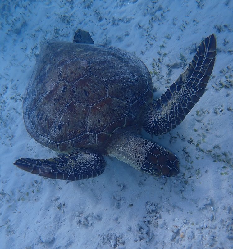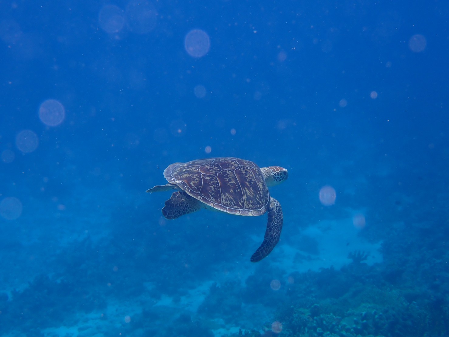 安室島に一緒に行った同宿の人が、ウミガメが高確率で見れるから潜ってみると言うのでしばしお付き合い。潜ってすぐにお食事中のウミガメ発見。ビーチ自体は遊泳エリアも決められており珊瑚礁も少ないので魚もほとんどいませんでしたがウミガメを見れたので良しとします。このビーチは宿から徒歩3分なので、朝の散歩や星空観察、夕涼みなどで大変お世話になりました。