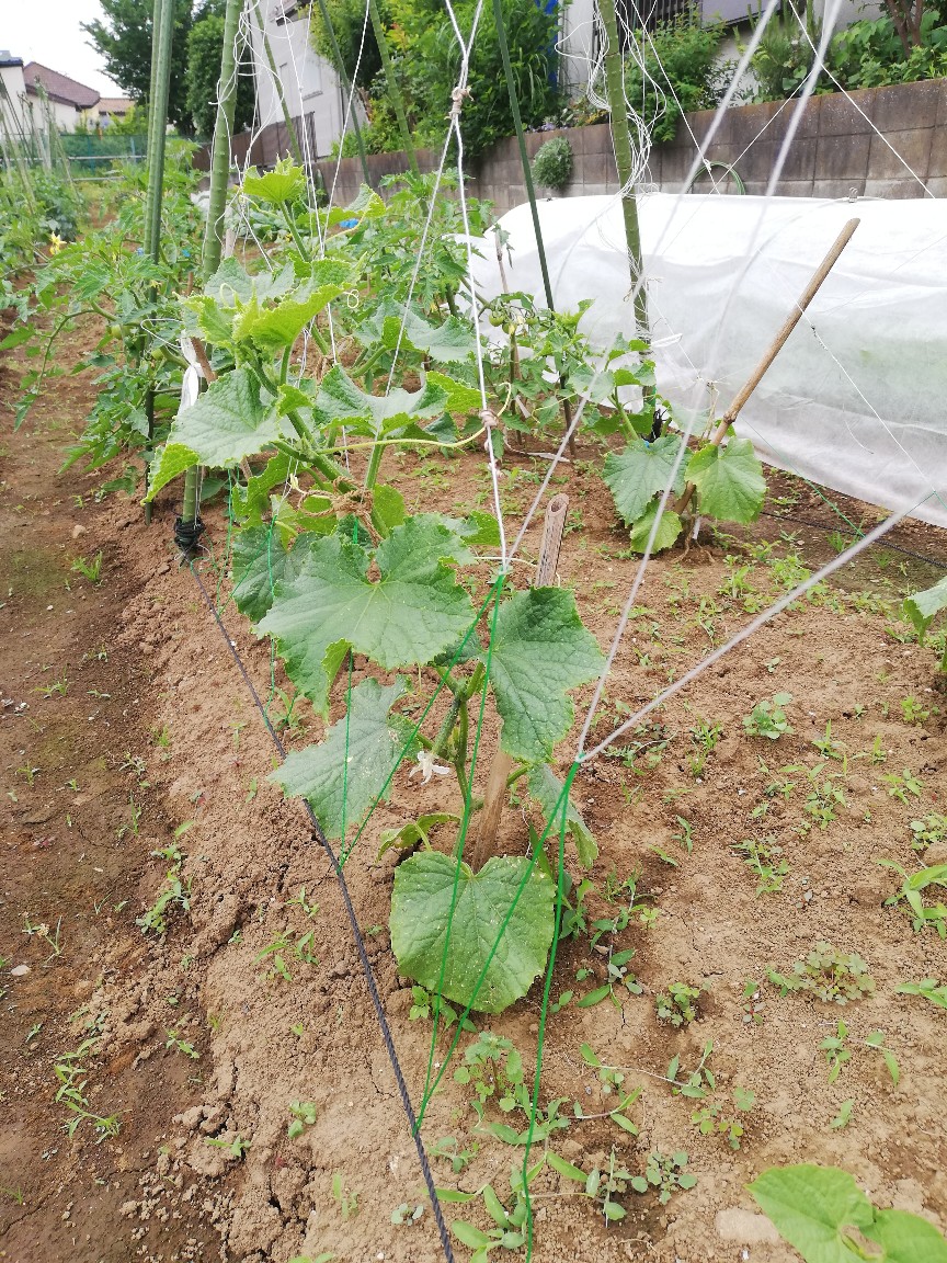 ③支柱へツルを誘因して結んでいる紐が複数箇所あるが、その紐の内側で実がなっていることに気づかずに紐がからまって傷ついてしまったキュウリがいくつかあったので、実の付き具合を適宜確かめながら紐の結び場所を変える等の処置をする。