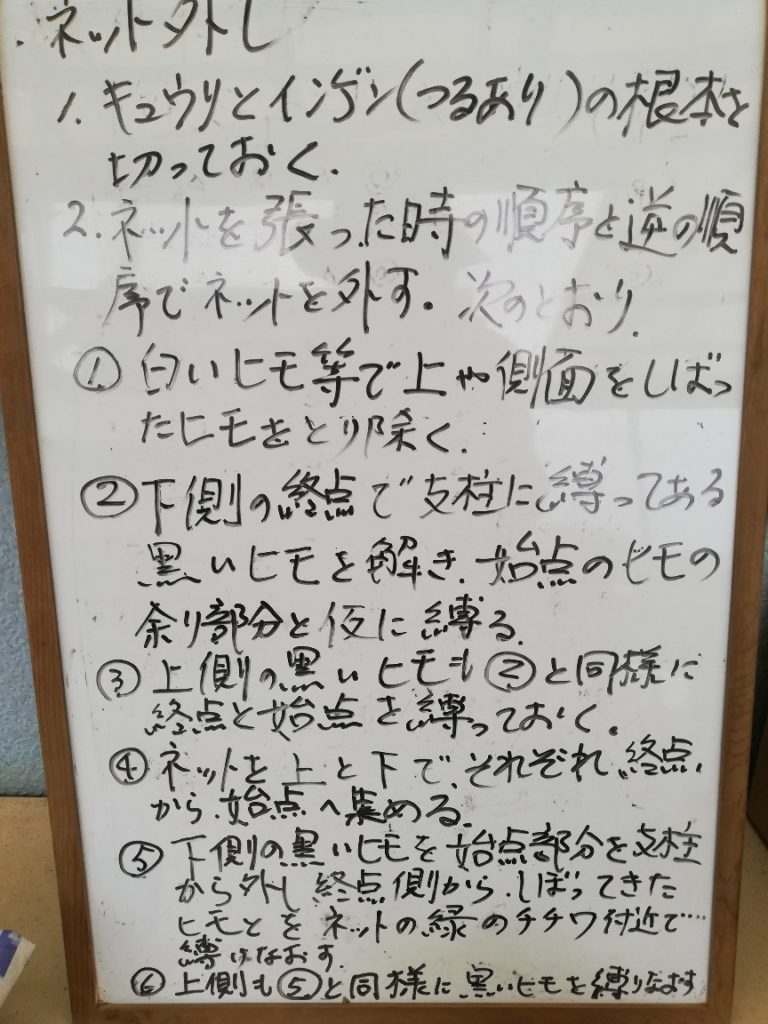 ネットは次回再利用するので外してただ丸めておけばいいという訳ではありません。構造がけっこう複雑なのでいい加減に片付けると次回使用する時にネットが絡まっていたり、たるみなくピンとはることがうまくできなくなってしまい、余計な時間と労力を使うことになるため、園主から細かい注意事項の説明と実演がありました。