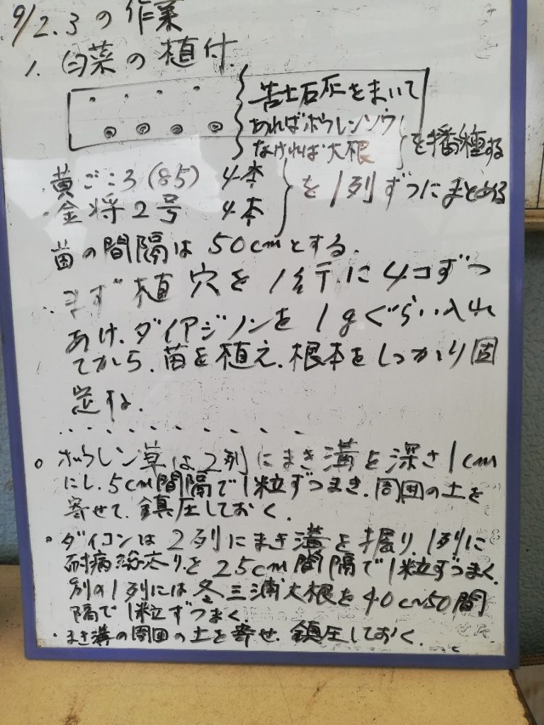 今日は白菜の苗の植え付けとほうれん草の播種をしました。作業内容はホワイトボード参照。園主からの説明は以下に記載。