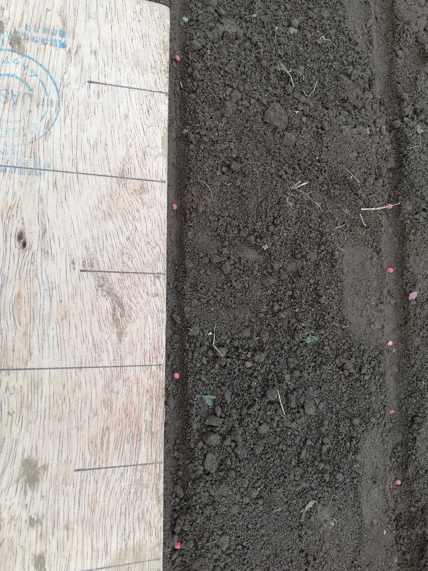 本来2列だが、今回は3列にして播種。1と3列目は5cm間隔、間の2列目は10cm間隔で1粒。