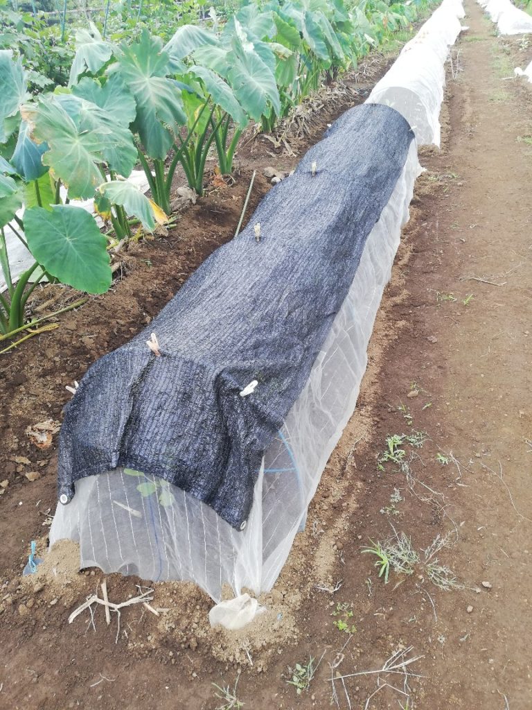 ③白菜畝の防虫ネットの上に黒い遮光シートがはってあります。