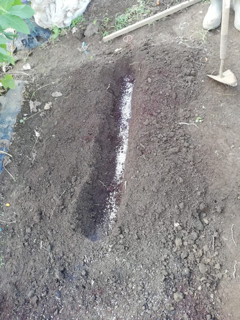 畝の真ん中に溝を掘って化成肥料をまいて耕すそうです。