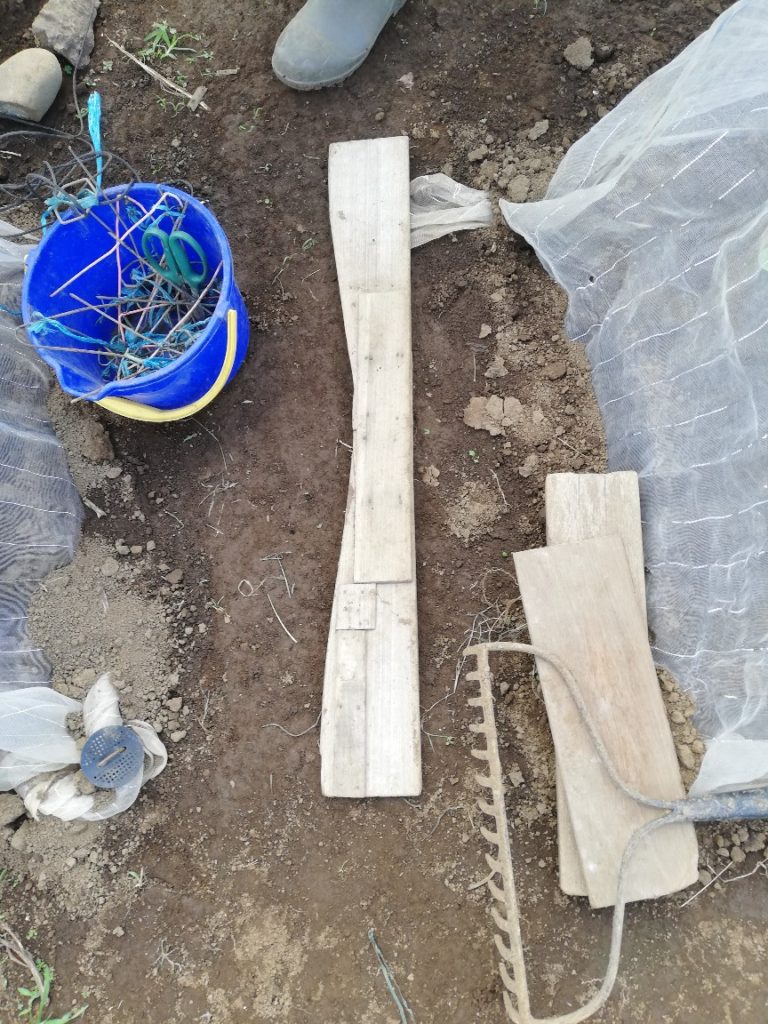 ①真ん中にある板ですが、これは黒マルチシートをはる際に畝を均等にならしつつ土を盛るためのものです。マルチシートは土にピタッとはることができないと本来の役目(保湿)を発揮できないのですが、ピタッとはるのはなかなか難しいようでですがこれを使うとやりやすいと言ってました。