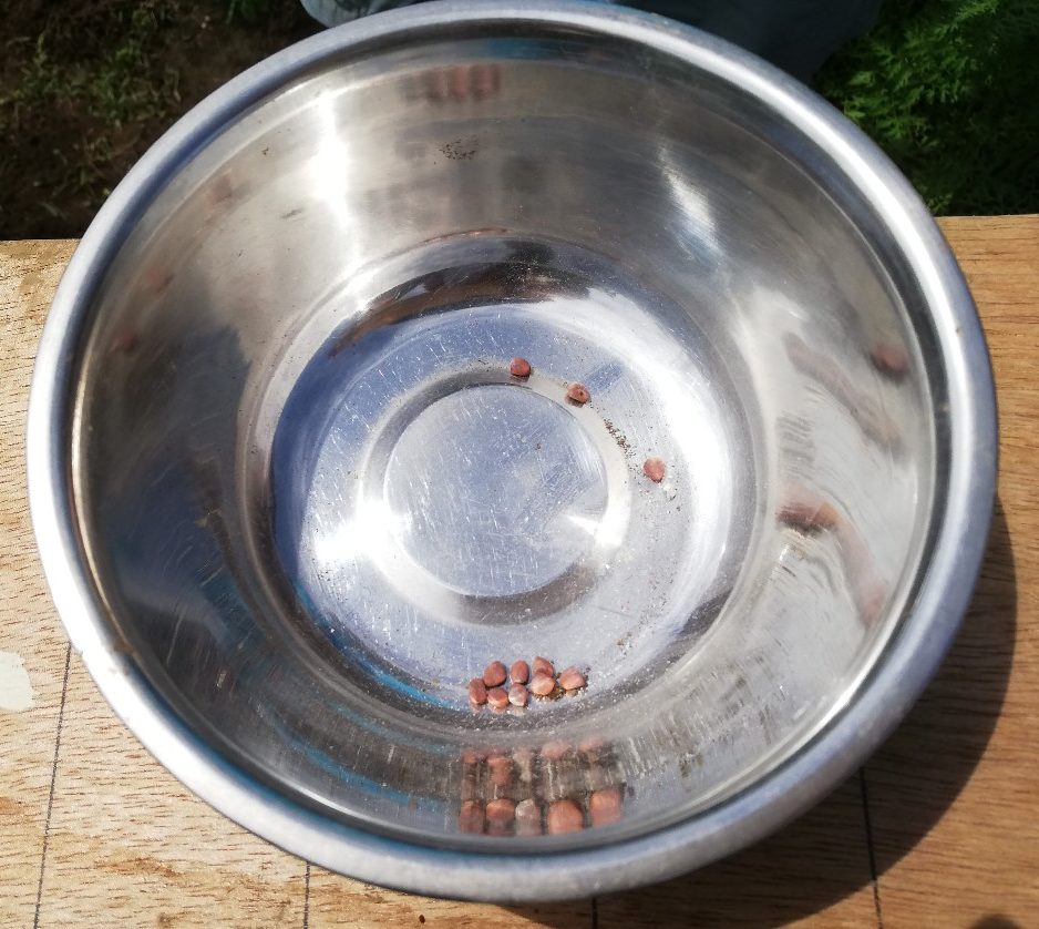 この畝には昨年度の里芋残りにより発芽して葉を伸ばしていた株があり、どうなっているのかずっと気になっていたので掘ってみましたが、種芋のみで子芋すらできていませんでした。何のケアもせず日当たりもよくなかったので当然なのでしょうが、何だかちょっとがっかりしました。
