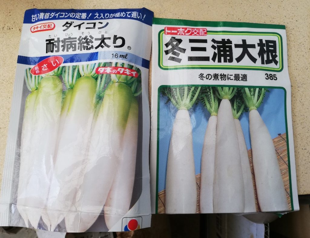 ※三浦大根はうまく育てば地中で真ん中が20cm位の太さになるので広いスペースが必要とのことです。種を多めにもらったので、三浦大根は1穴に種を2粒ずつまきました。無事に発芽することを祈ります。