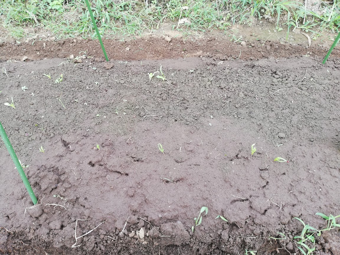畝自体の乾燥により地割れを起こしておりほうれん草がほとんど発芽していませんでした。不織布は水を弾いてしまうため雨が降っても土に水が届かなかった可能性があります。また9日に化成肥料を施肥した際に畝の両脇を掘ったのですが、その影響か畝自体の表面が凸凹してしまい一部種がむき出しになってしまっていたようです。一時しのぎといえど不織布を防虫ネットにするのは大失敗でした。
