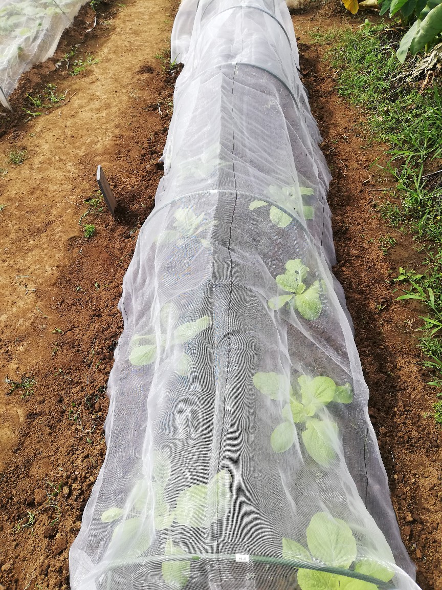 ほうれん草と白菜畝の不織布を外し防虫ネットへはりかえました。