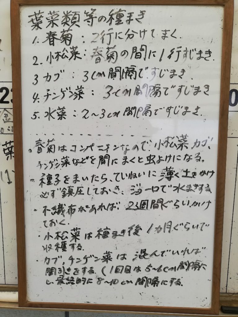 春菊、小松菜、カブ、チンゲンサイ、水菜の種が配られました。