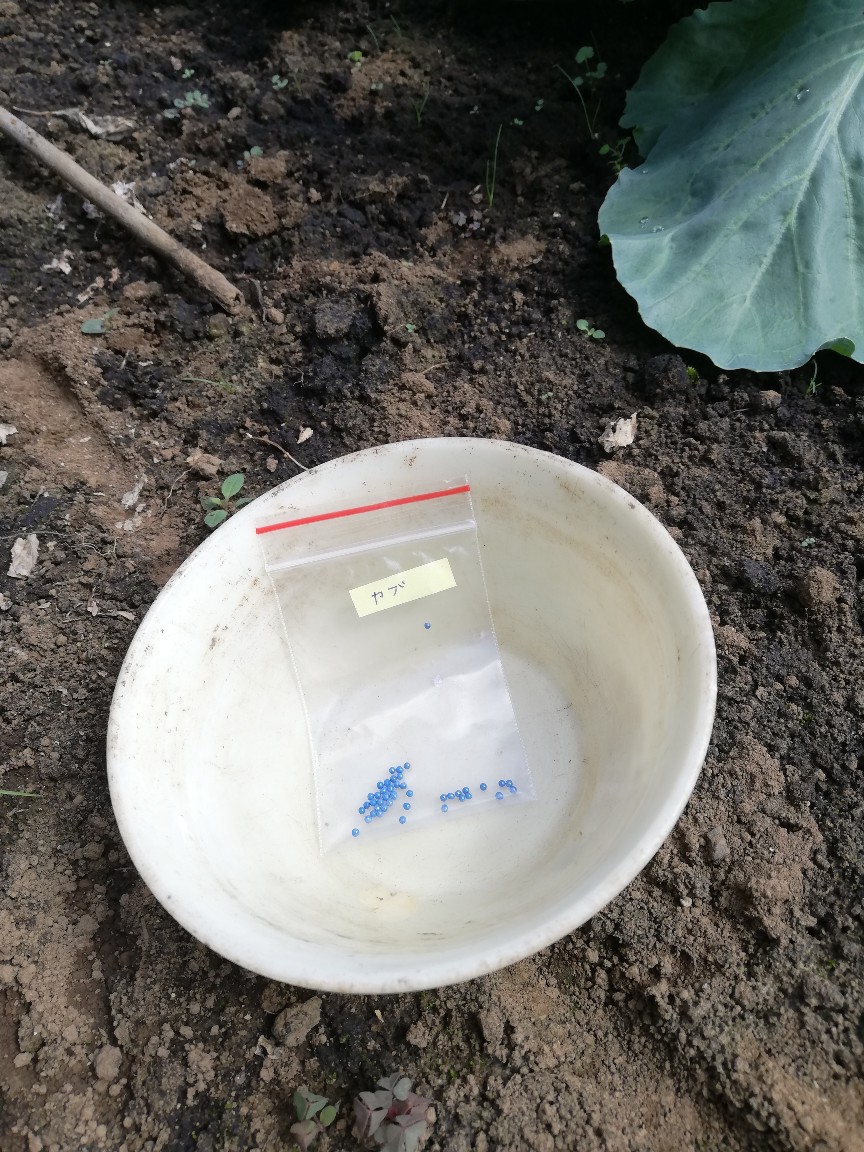続いて、活着しなかったキャベツ苗を4本廃棄し、そこにカブの種をまくことにしました。