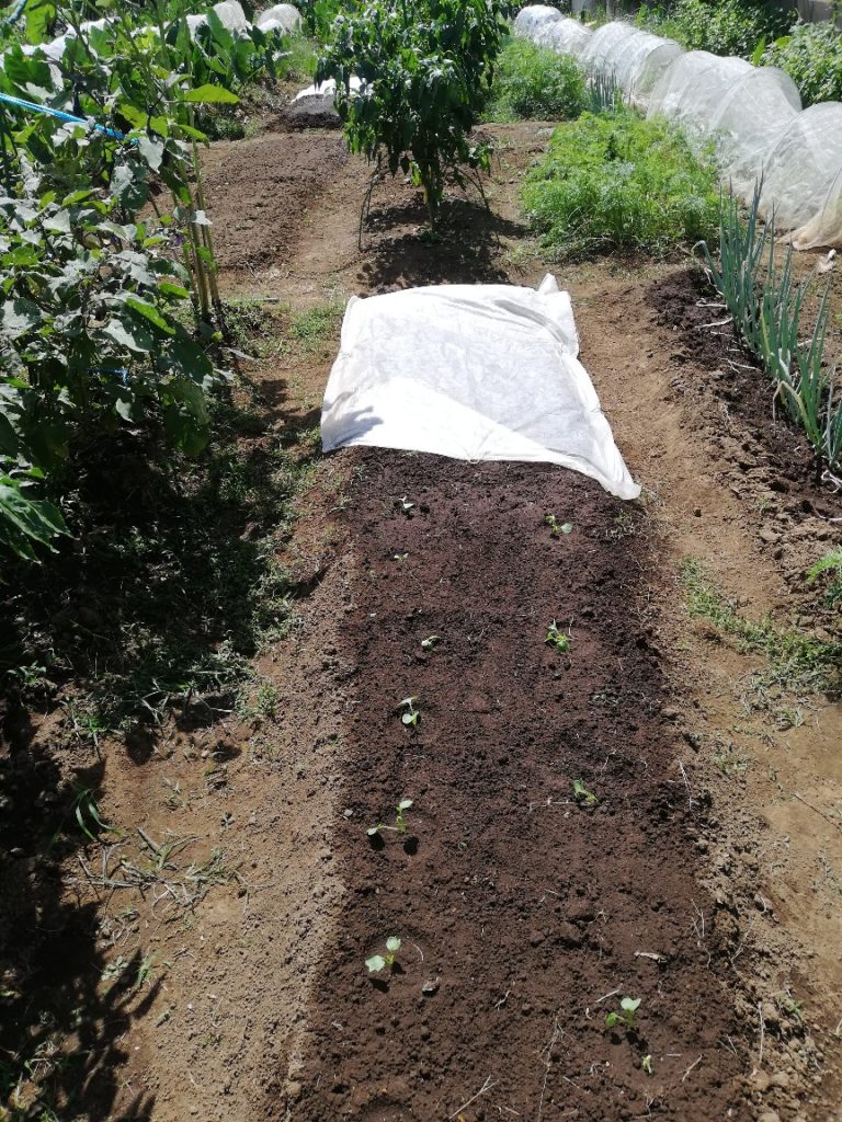 大根:発芽おおむね良好、奥の不織布の下には青菜3種類を蒔きました。