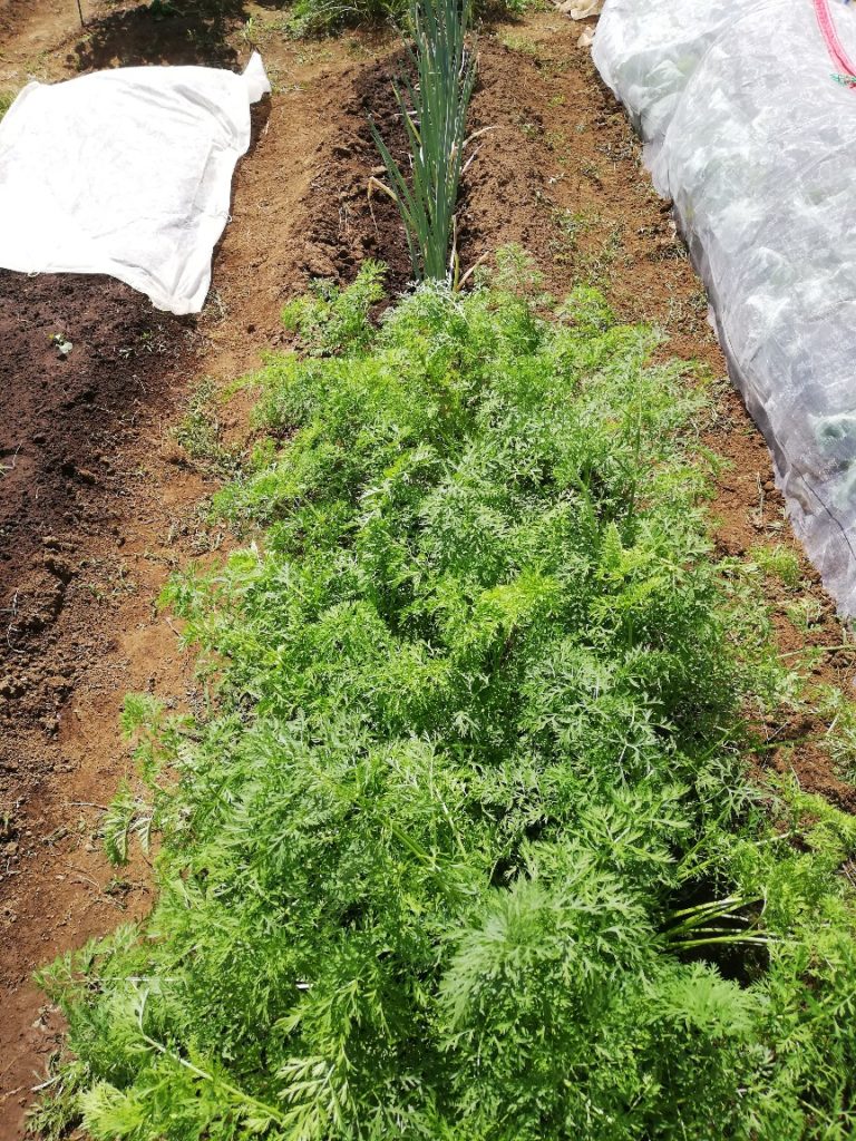 人参青々元気です。私たちは人参そのものより、人参葉の天ぷらを楽しみにしています。葉っぱを必ず守り抜きます。