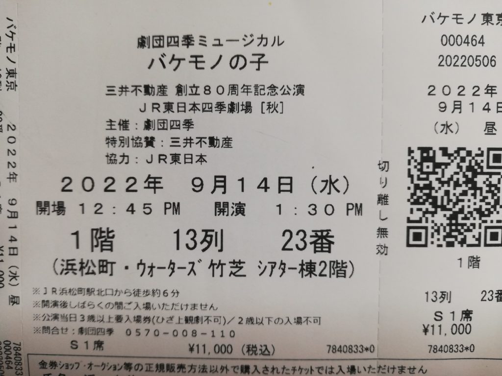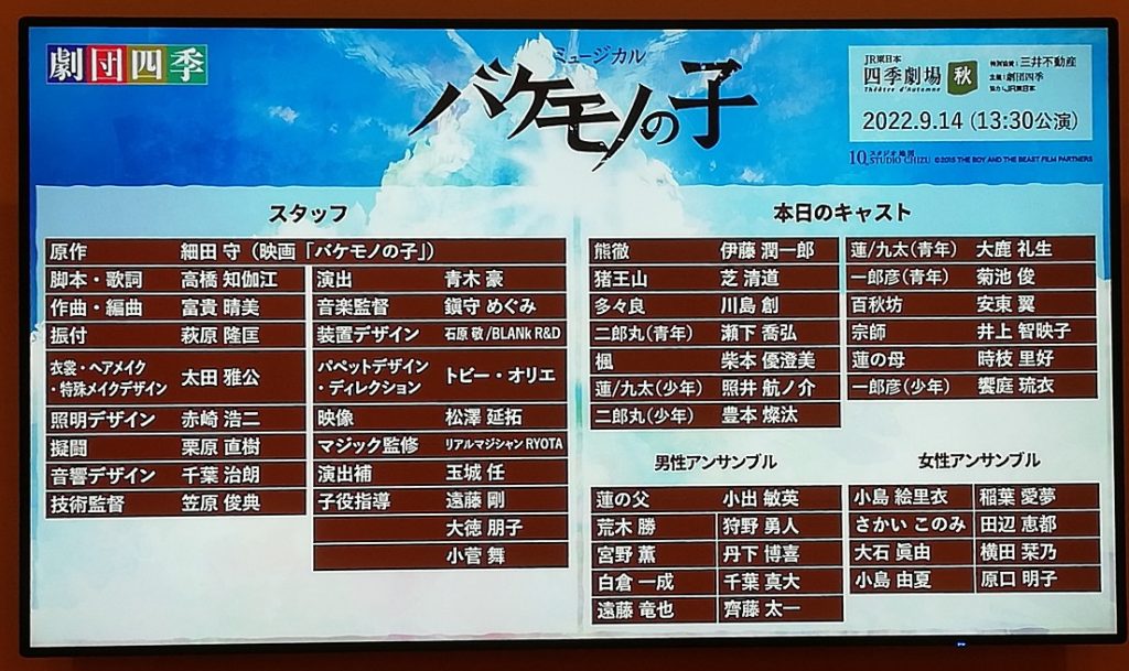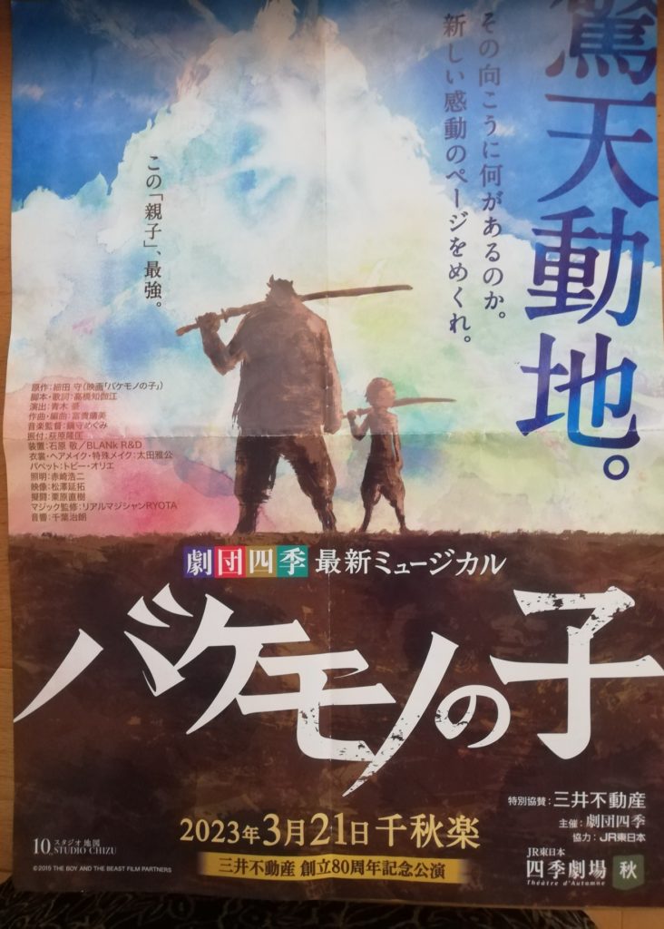今日は母親と劇団四季のミュージカル”バケモノの子”を見に行きました。