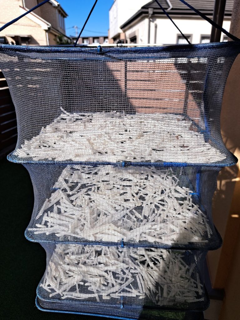 お庭の掃き掃除、育苗ポットへの水やり、ダンボールコンポストの攪拌、朝の連ドラを見た後は、先日畑で収穫した大根を干しました。