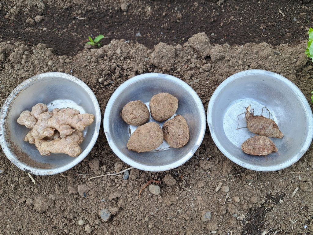 今回は選ぶのが最後のほうになってしまったので、あまりいい親芋が残っていなかったようで多少生育に不安がありますが、その分生姜を2つやってみたらと1つ余分に生姜をもらいました。