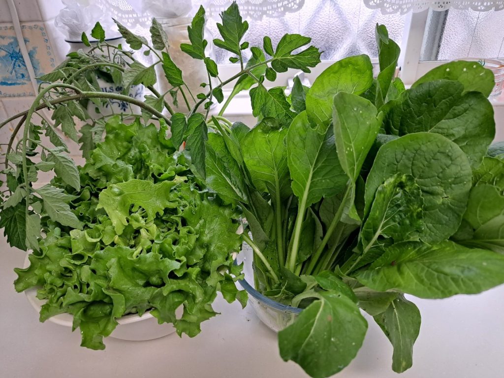 今年度の初収穫はリーフレタスと小松菜です。