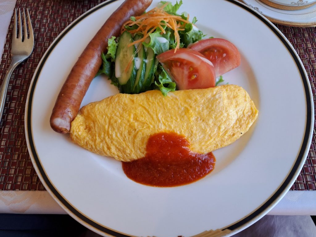 大きなソーセージ、ふわふわオムレツとても美味しかったです。ちなみにパンはおかわり自由だったので、合計3ヶいただきました。フルーツもおしゃれにカットされており見た目がきれいでした。