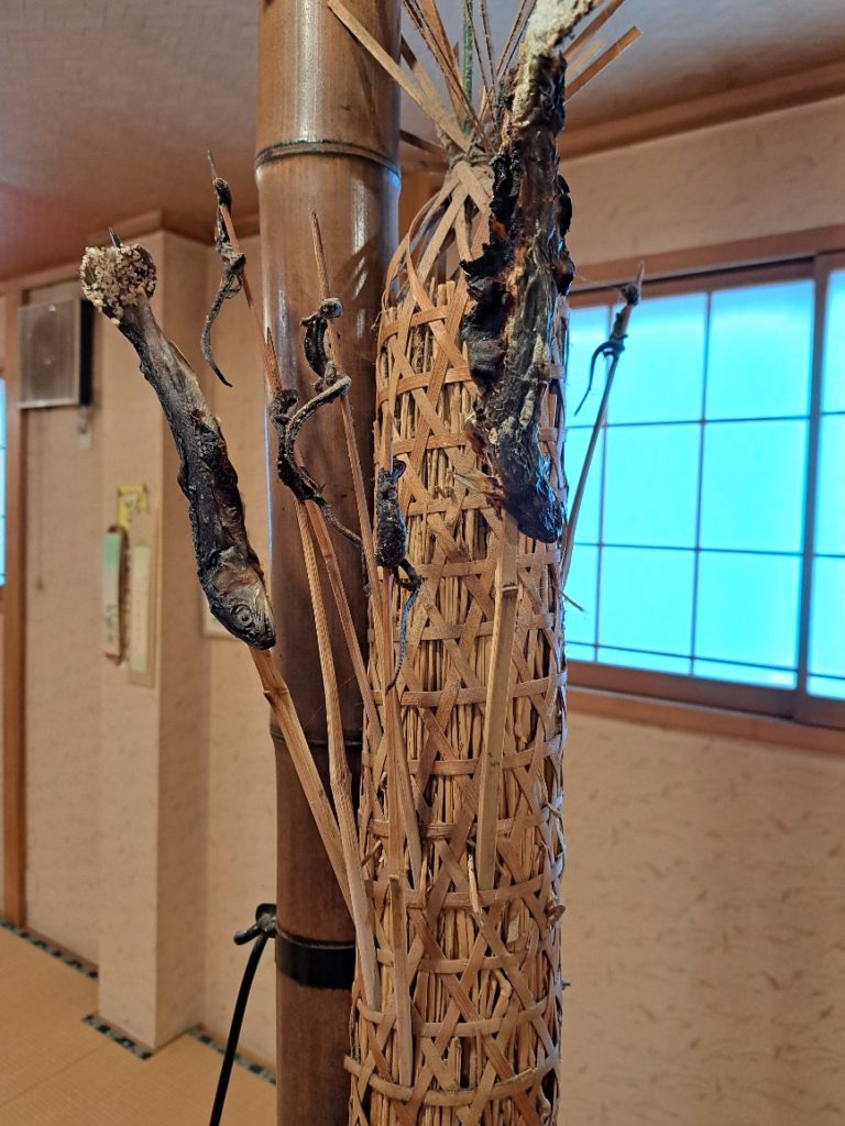 囲炉裏の上にはサンショウウオと岩魚のオブジェ?本物?がそれっぽく飾られています。