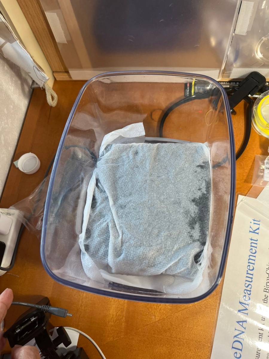 種は下記写真のようにスポンジの切り込みに埋め、種が乾燥しないように不織布をかけました。