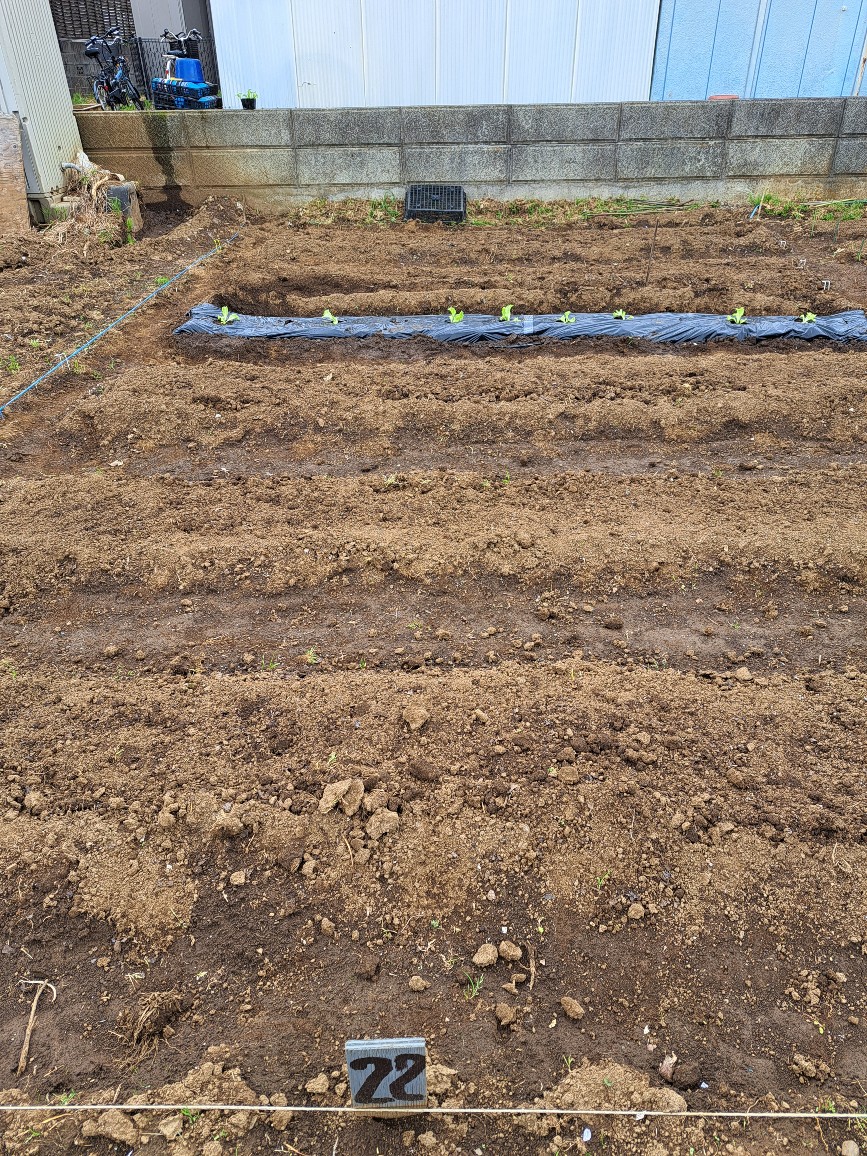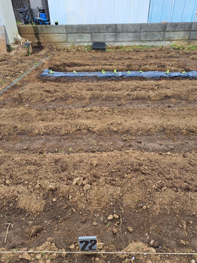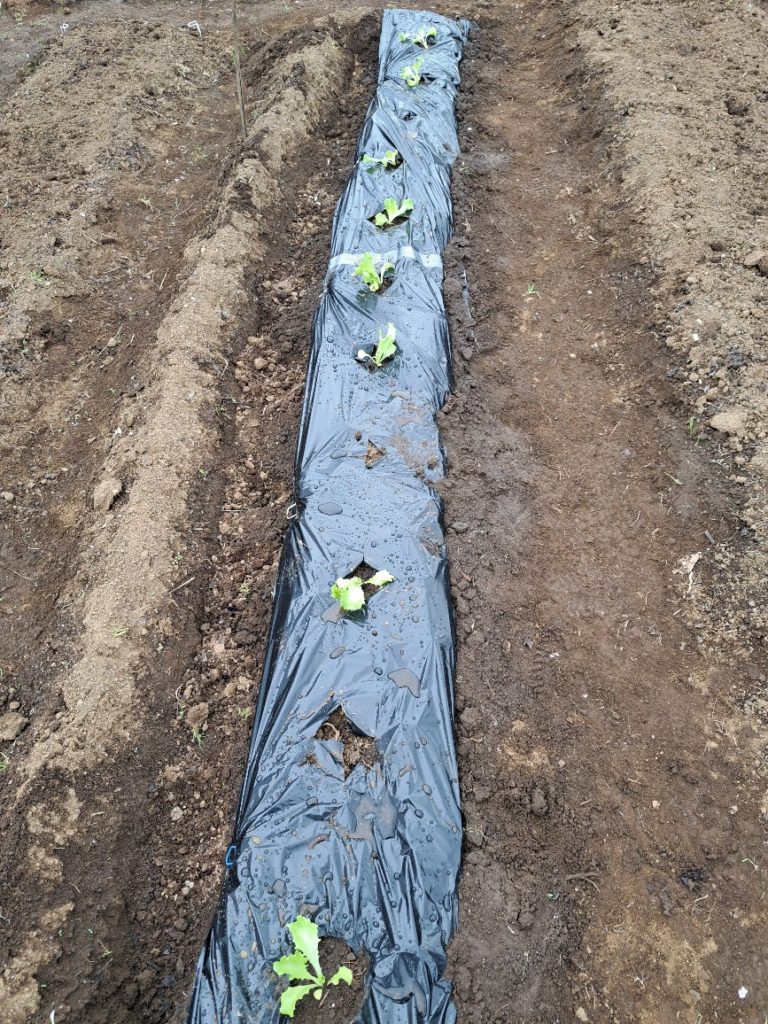 また冬の黒マルチを使ったレタス栽培で外葉が土に接触せずきれいに収穫できることが分かったので、黒マルチに穴を空けレタス苗を植えました。