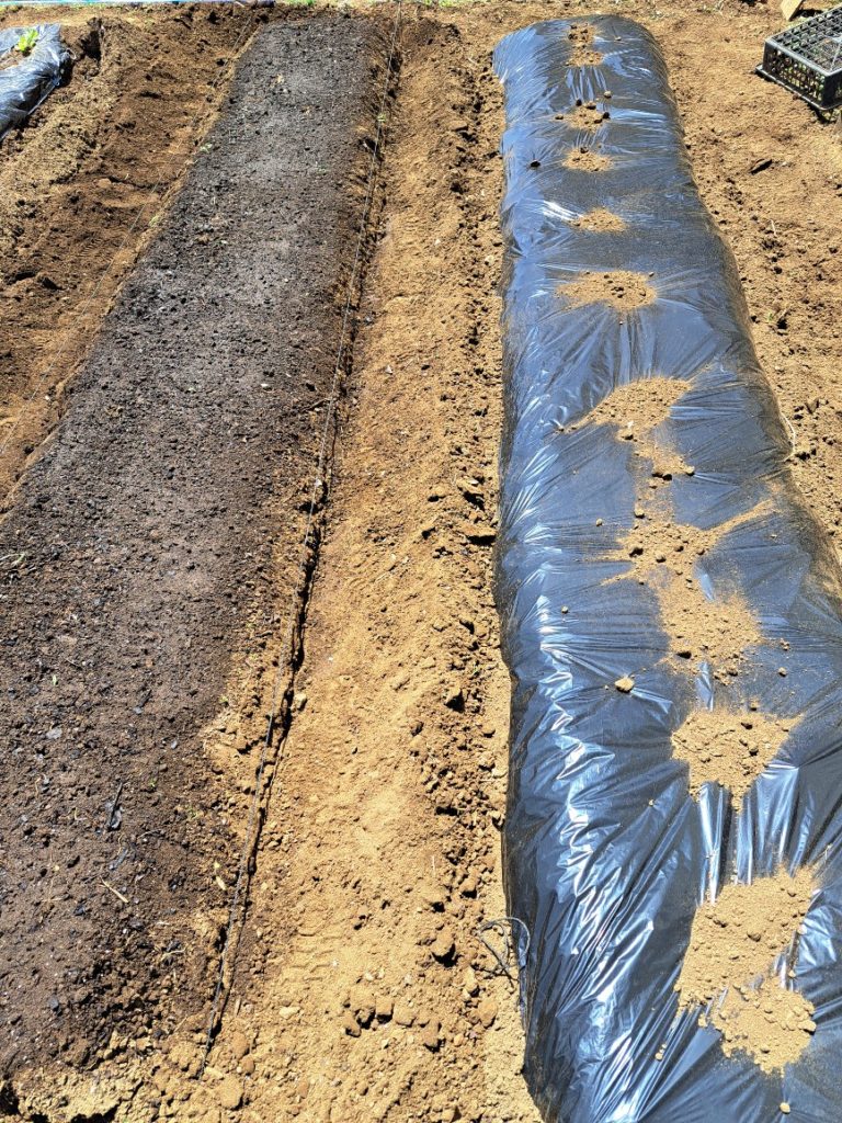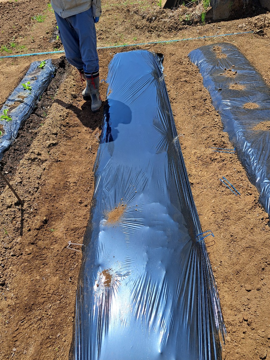 ③黒マルチが風でバタバタしないように、適量の土をマルチの上にかけておくこと。