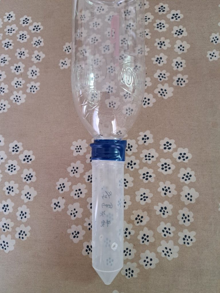上部分は500㎖のペットボトルを切断したもの、下部分は注射器みたいな遠沈管というものの先端に小さな穴を4つ開けたもので、それをテープで接着しています。