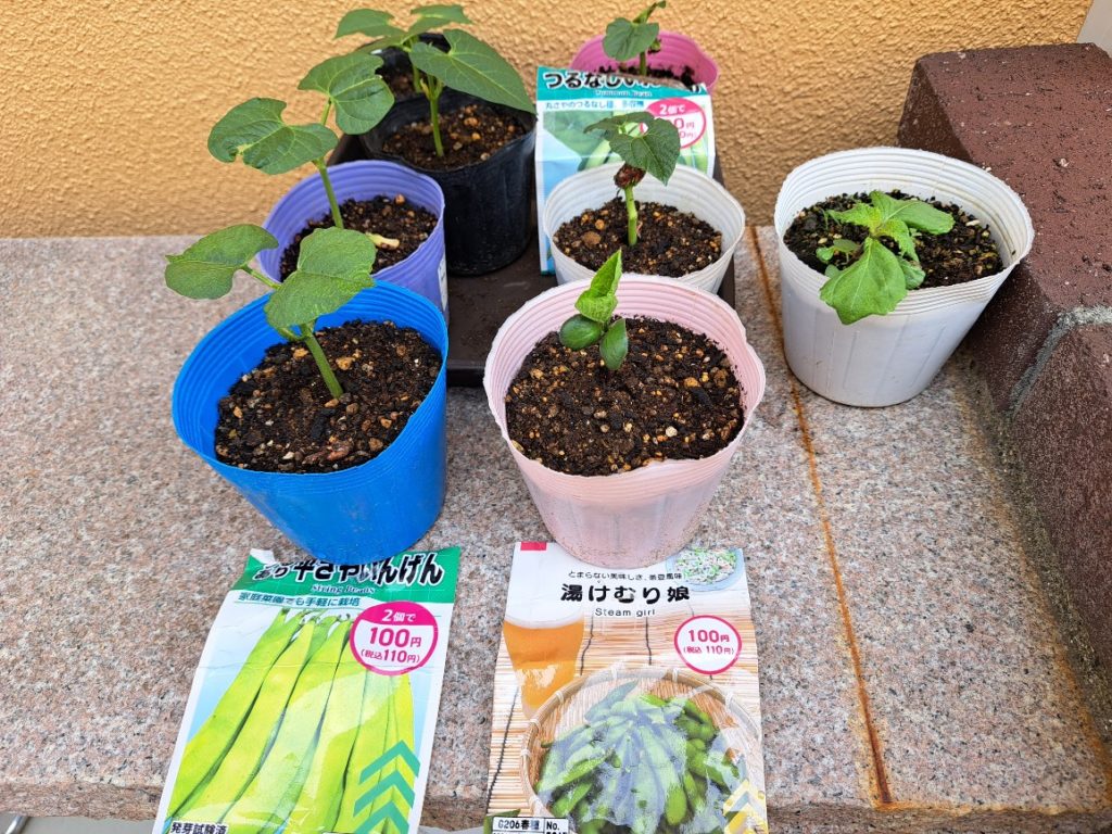 ツルありインゲン×1、ツルなしインゲン×5、枝豆×1の合計7ポット分となりますが、時期が随分ずれてしまったので、先行隊の日影に埋もれてしまったりもあるのでうまく育つか心配です。