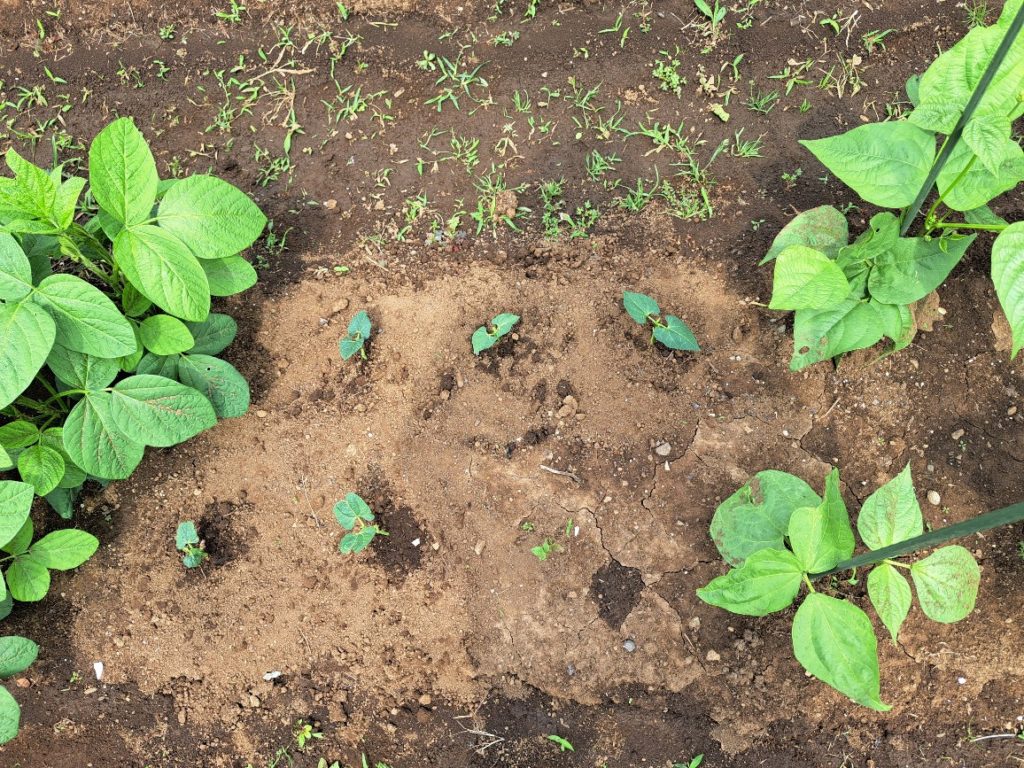自宅にてポット発芽させていた豆類を畑に移植しにいきました。