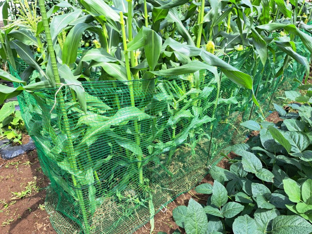 今年はトウモロコシが順調に育ってきているので、雄花を切って花粉をばらまきハクビシン対策のネットをはりました。