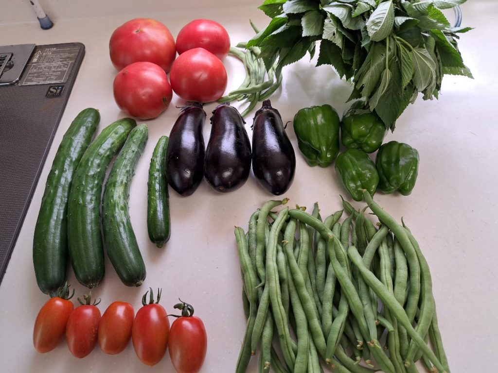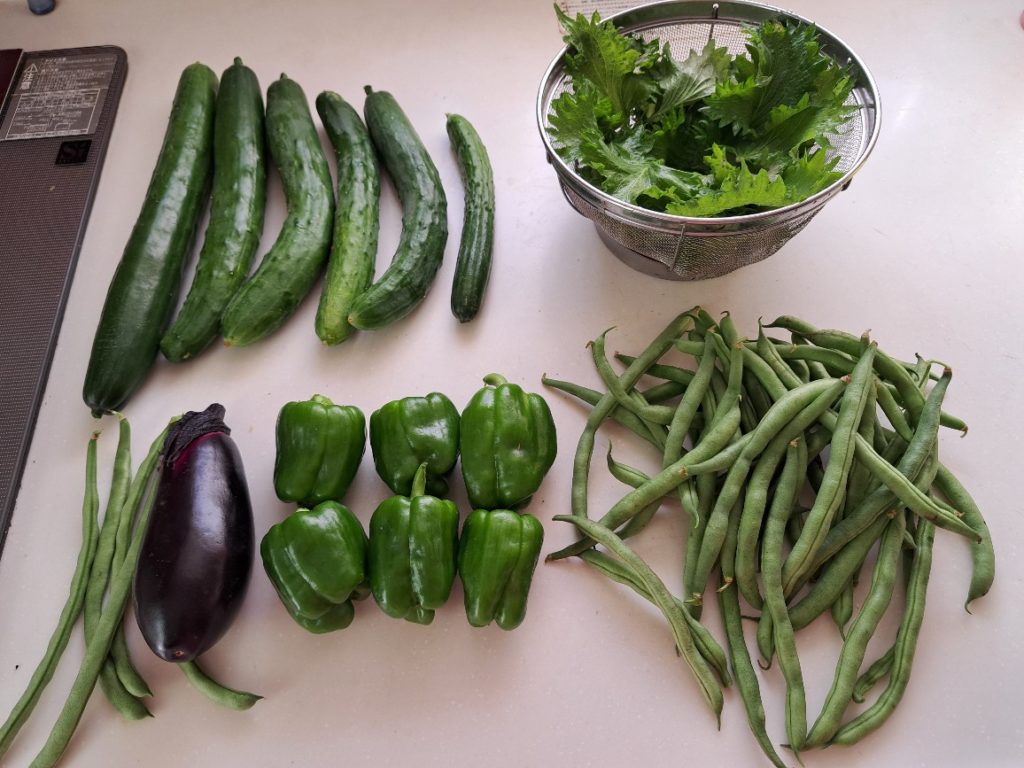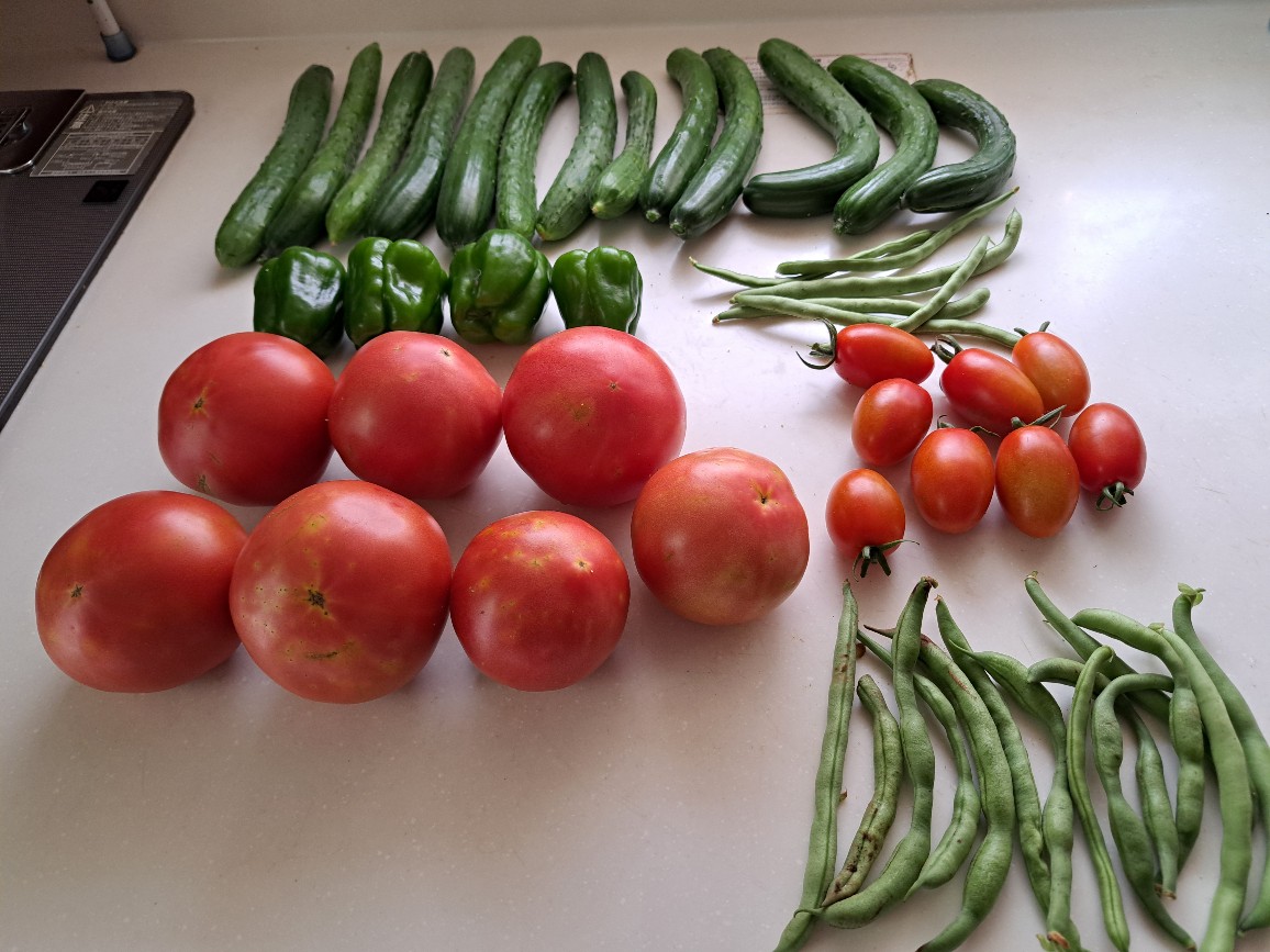 ほぼ連日畑に行くのは、そうそうキュウリのせいなんです。旅行前に花や赤ちゃんキュウリを全て摘み取りほどほどだった収穫が、再び絶好調になってしまいました(泣き笑い)