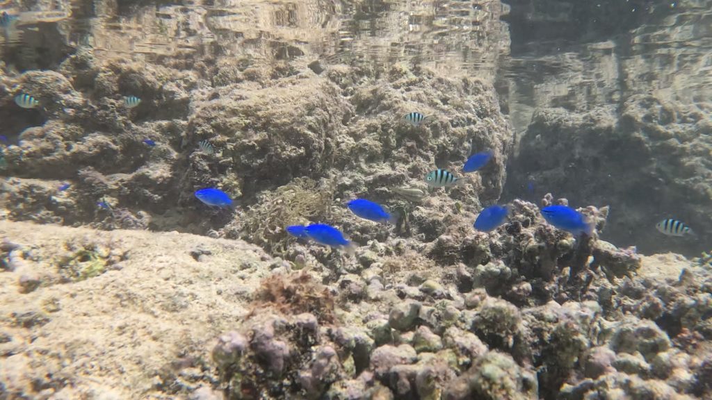 干潮近かったので堤防の周りは足がつくほど浅かったのですが、珊瑚は色鮮やかでカラフルなお魚がいっぱい、堤防の手前から先端、反対側へとグルグルしちゃいました。
