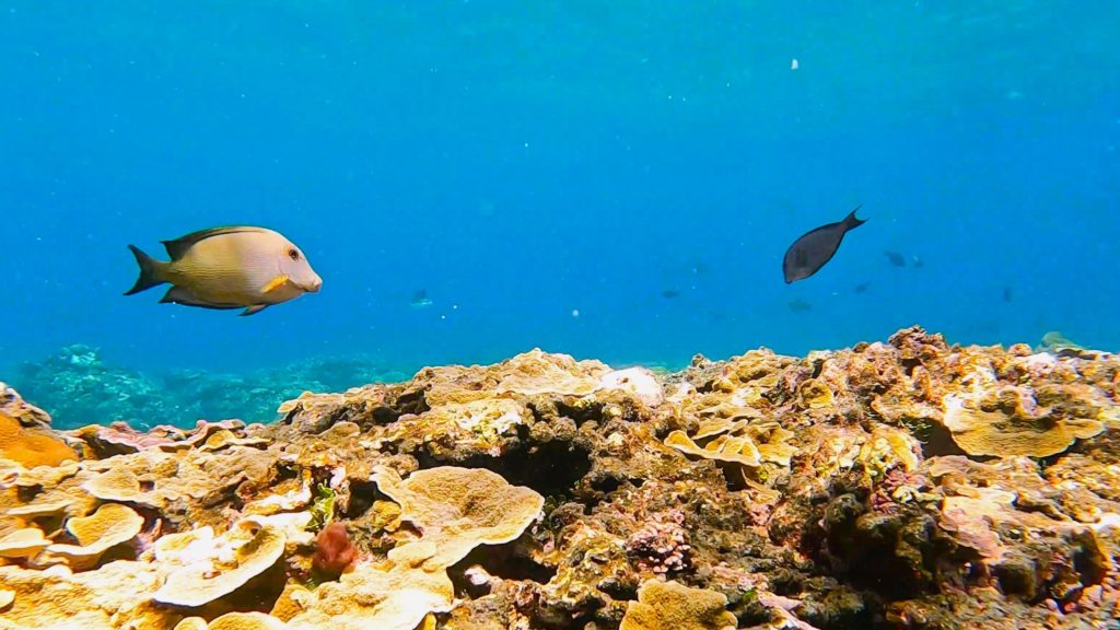 珊瑚礁は全滅でどこまでも広がる茶色い世界、お魚もほとんどいません。