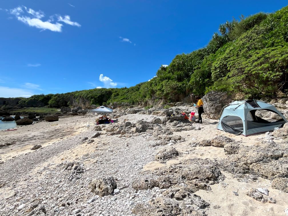 右側エリアは砂場で平坦なためテント乱立の密状態、左側エリアは岩場でゴツゴツ、平坦な場所がほとんどないため、人がほぼいません。
