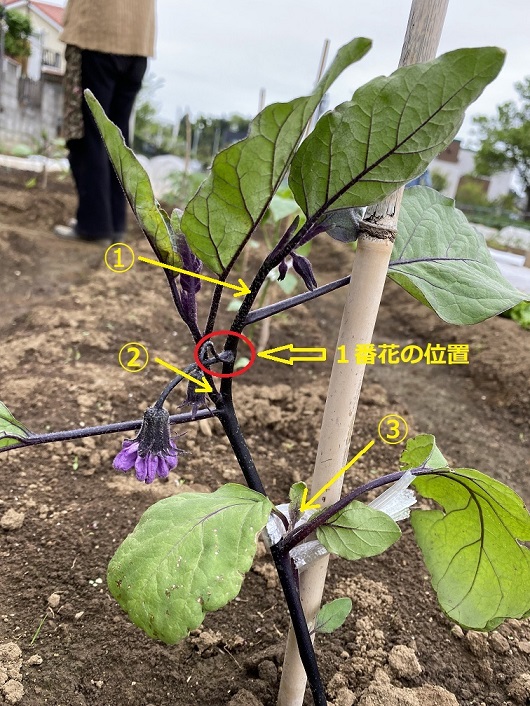 ナス経過観察 公開日:2022年5月17日 1.体験農園各種野菜園芸 4月22日 苗の植え付け 5月6日 仮支柱から長めの支柱へ ★整枝方法3本仕立てとする。1番花のなり口があるのが主枝①、そのすぐ下の枝が主枝②、その下の枝が主枝③となり、その3本を残し、その下の芽はかきとる。 5月26日 […] 続きを読む